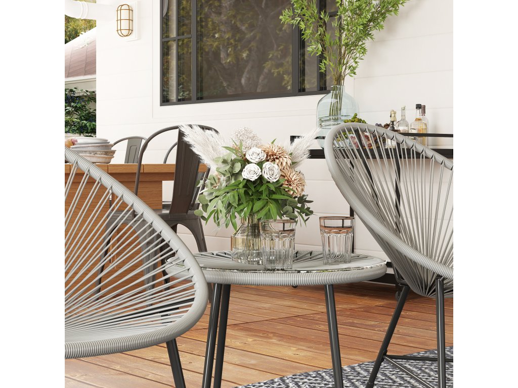 Zahradní nábytek Outsunny 3dílná sada, 2 plastové ratanové židle, 1 stůl se skleněnou deskou, ocelový rám, venkovní posezení, šedá
