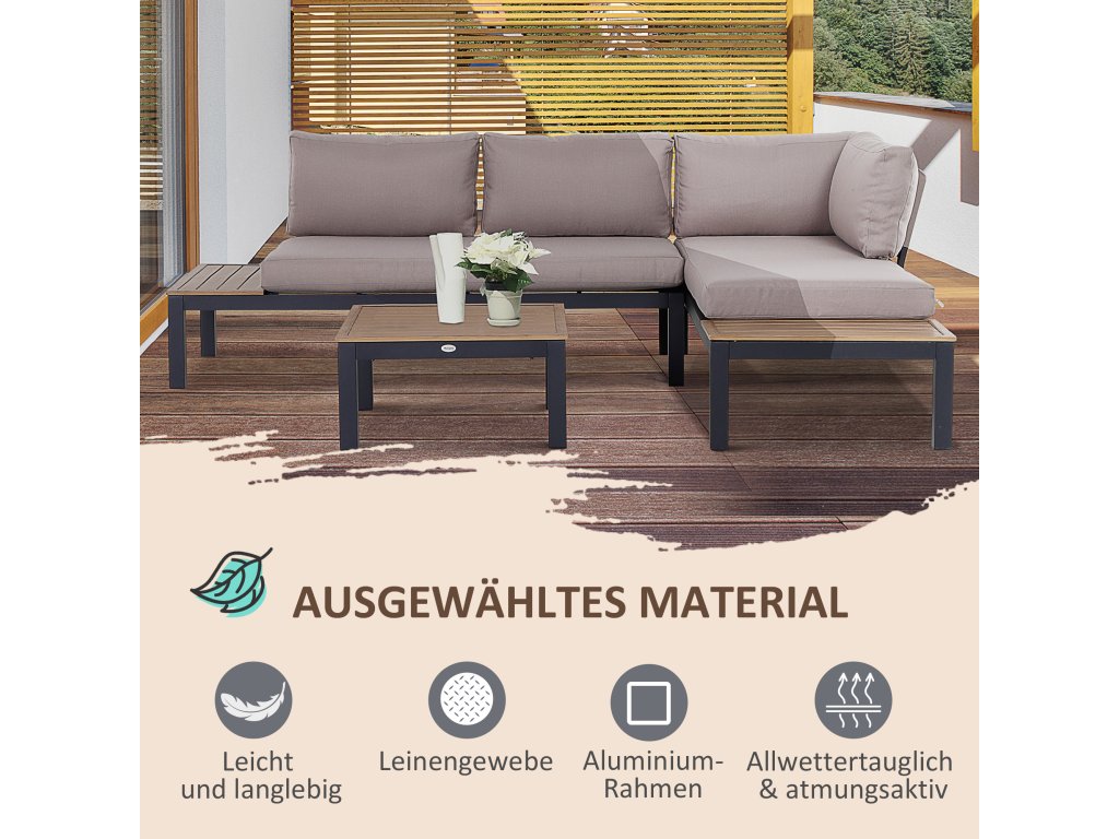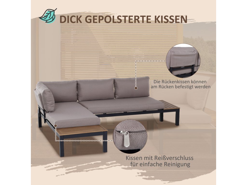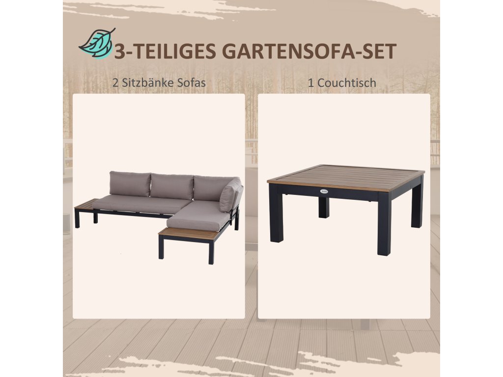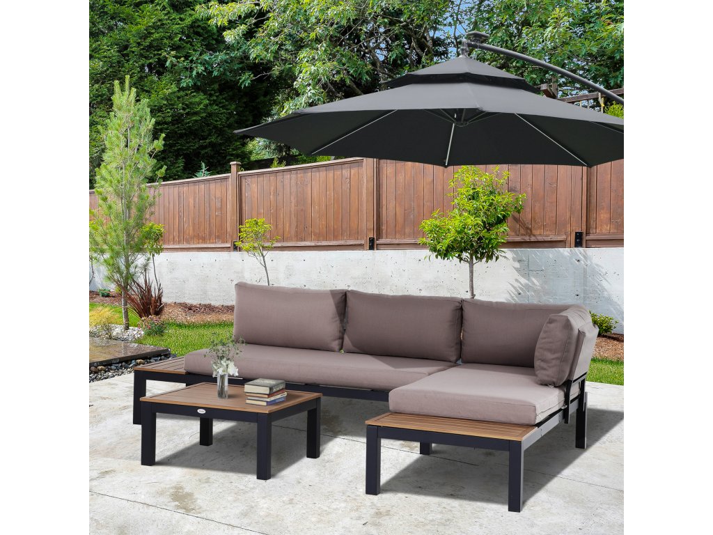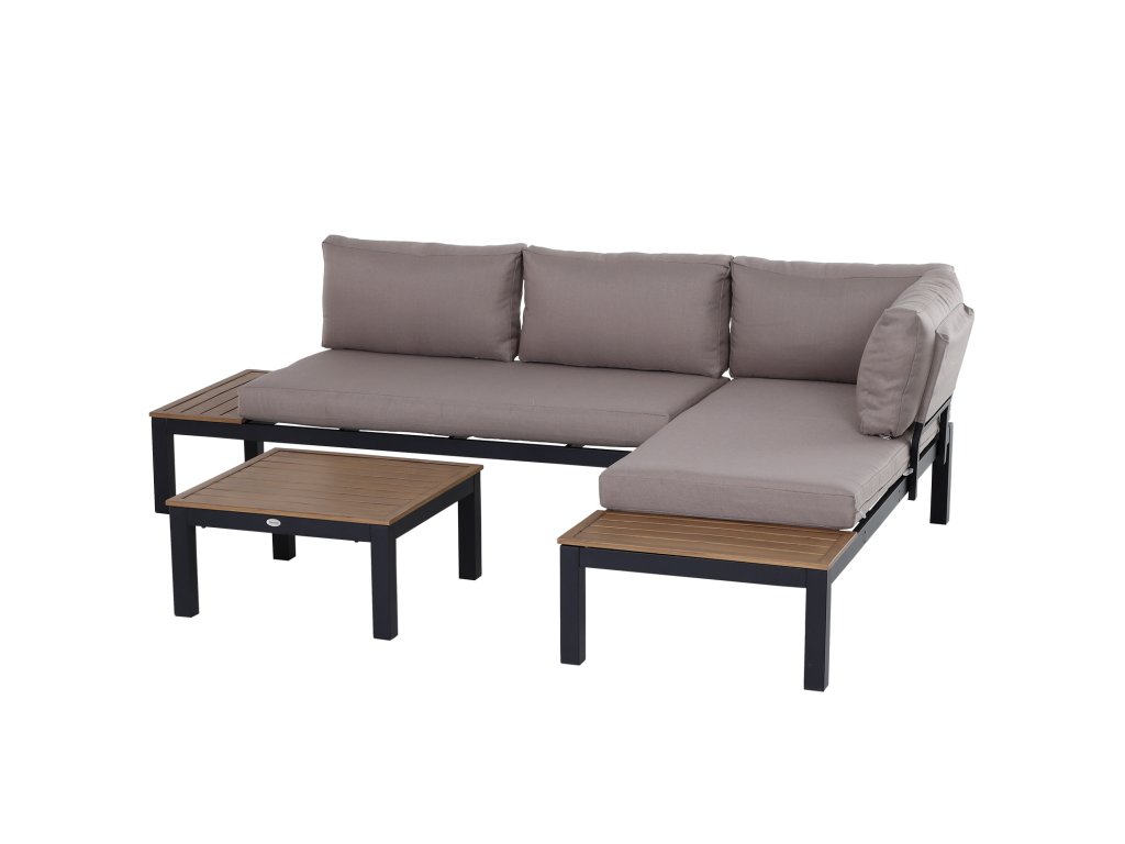 S touto třídílnou sadou zahradního nábytku se můžete vrátit k základům. Hliníkový rám zajišťuje odolnost a pevnost, je odolný proti korozi a lehký, takže můžete vše snadno přepravovat. Hustě polstrované polštáře na sedáku a opěradle zajišťují pohodlné sezení, zatímco lamelový stolek a odkládací plocha na boku pohovky poskytují dostatek úložného prostoru a snadno se čistí.