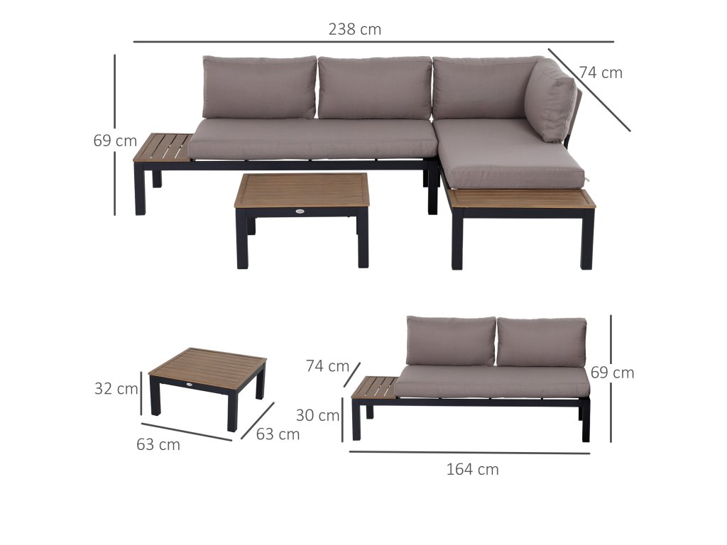 Zahradní nábytek Outsunny pro 3 osoby se stolkem, pohovka s polštáři, venkovní, hliník, 164 x 74 x 69 cm