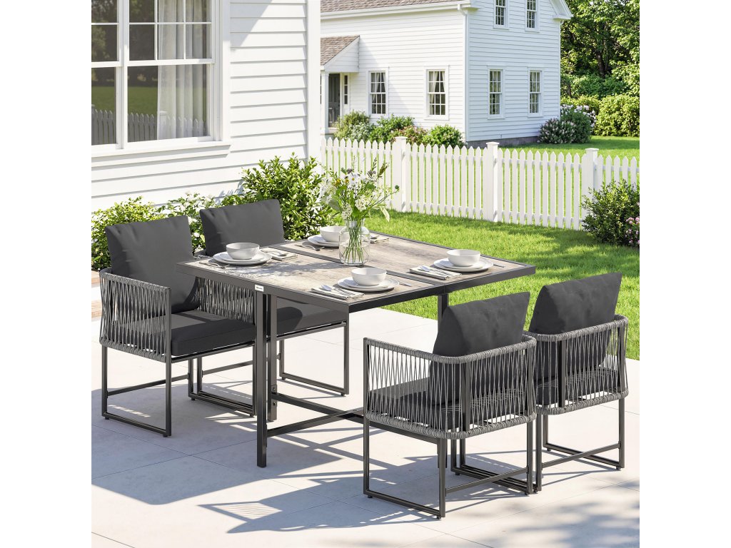 Zahradní nábytek Outsunny z polyratanu, 5dílná, prostorově úsporná sedací souprava, stůl se 4 židlemi, deska z DPC, polštáře, šedá