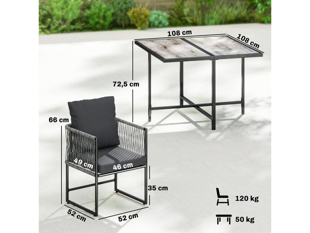 ✔ Maximální nosnost: 50 kg (stůl), 120 kg (židle)