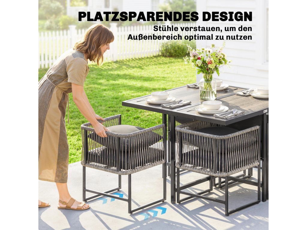 Chytrý design šetří místo: Ideální pro menší zahrady a terasy. Tato sada balkonového nábytku umožňuje zasunout všechny čtyři židle pod stůl o šířce 108 cm, čímž se ušetří místo. Uvolní se tak více místa venku a vaše terasa bude vždy vypadat uklizeně a příjemně.