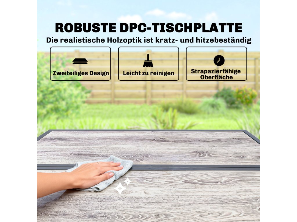 Dvoudílná deska stolu z DPC: Dvoudílná deska stolu této sady zahradního nábytku usnadňuje přemisťování, montáž a skladování, což šetří místo. Vyrobena z odolného DPC s realistickou šedou dřevěnou kresbou, je odolná proti poškrábání a teplu, takže je ideální pro venkovní použití.