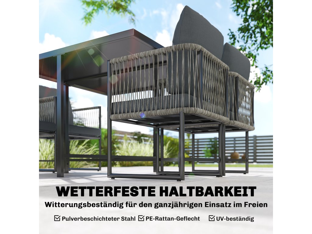 Celoroční odolnost: Tato sedací souprava je určena pro celoroční použití. Je vybavena práškově lakovaným ocelovým rámem a ručně tkaným PE ratanovým materiálem s 1000 hodinami odolnosti proti UV záření, což jí umožňuje snadno odolávat měnícím se povětrnostním podmínkám.