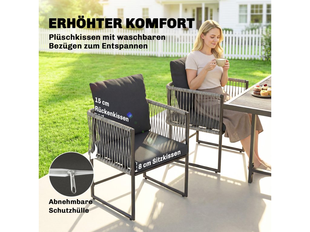 Vyšší pohodlí: Tato zahradní sada nabízí 8 cm silné sedáky a 15 cm silné opěradla pro maximální pohodlí při sezení. Potahy jsou odnímatelné a snadno se čistí, což poskytuje větší pohodlí a snadnou údržbu.