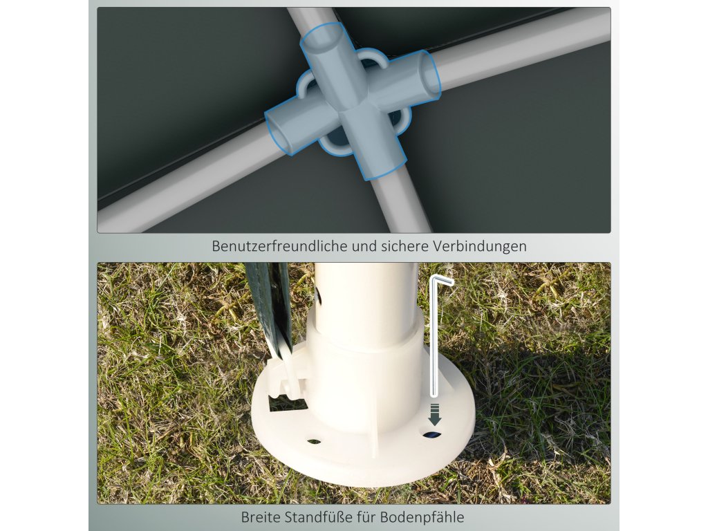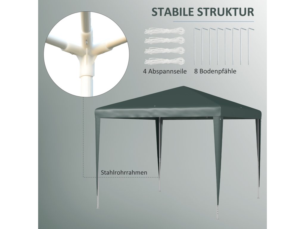 Robustní pavilon s ocelovým rámem: Ocelový rám s práškovým nástřikem zajišťuje stabilitu. Osm zemních hrotů a čtyři napínací šňůry jsou součástí dodávky a poskytují další podporu