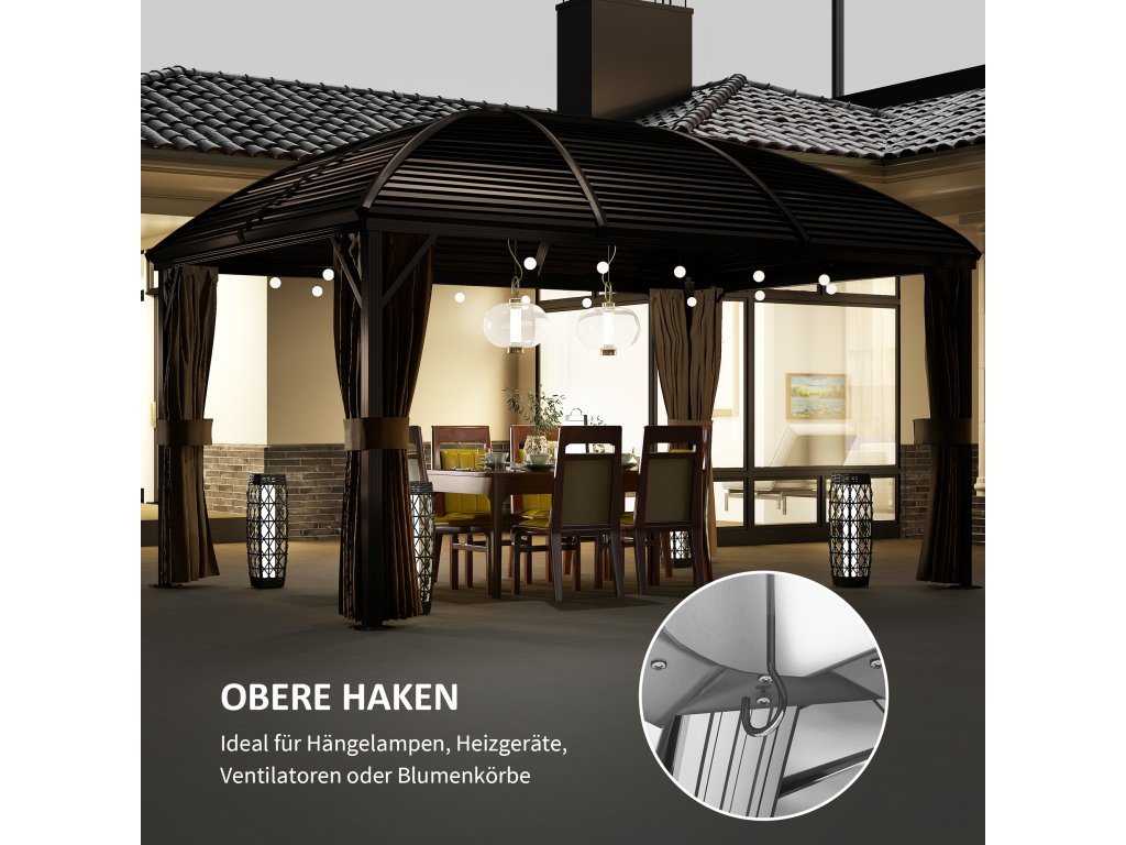Atmosférický: Dvojité boční panely zahradního altánu odolné proti povětrnostním vlivům nejenže nabízejí vynikající ochranu před hmyzem, větrem a povětrnostními vlivy, ale také poskytují dodatečné soukromí. Na stropní háky můžete zavěsit lucernu nebo terasový ohřívač.