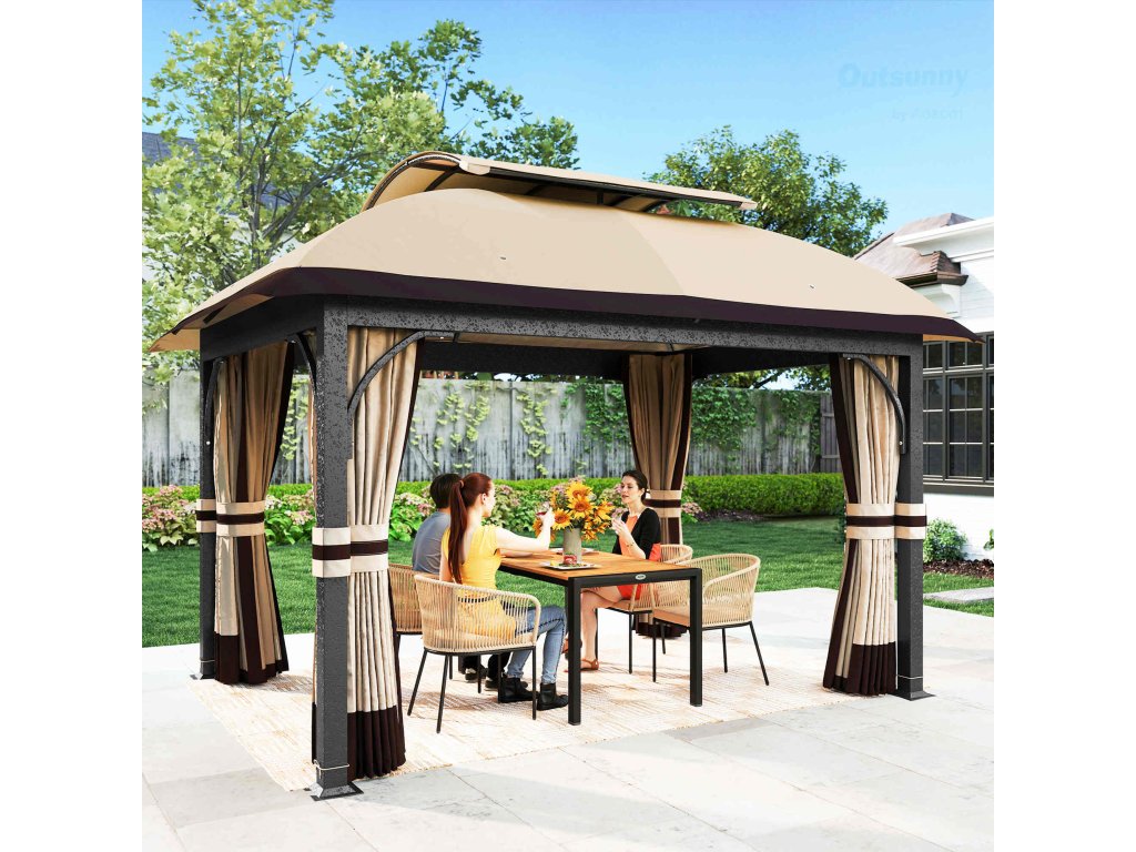 Zahradní pavilon Outsunny, zahradní stan 3,3 x 4 m se síťovými závěsy, dvoupatrová střecha, potah z umělé kůže, kovový rám, khaki