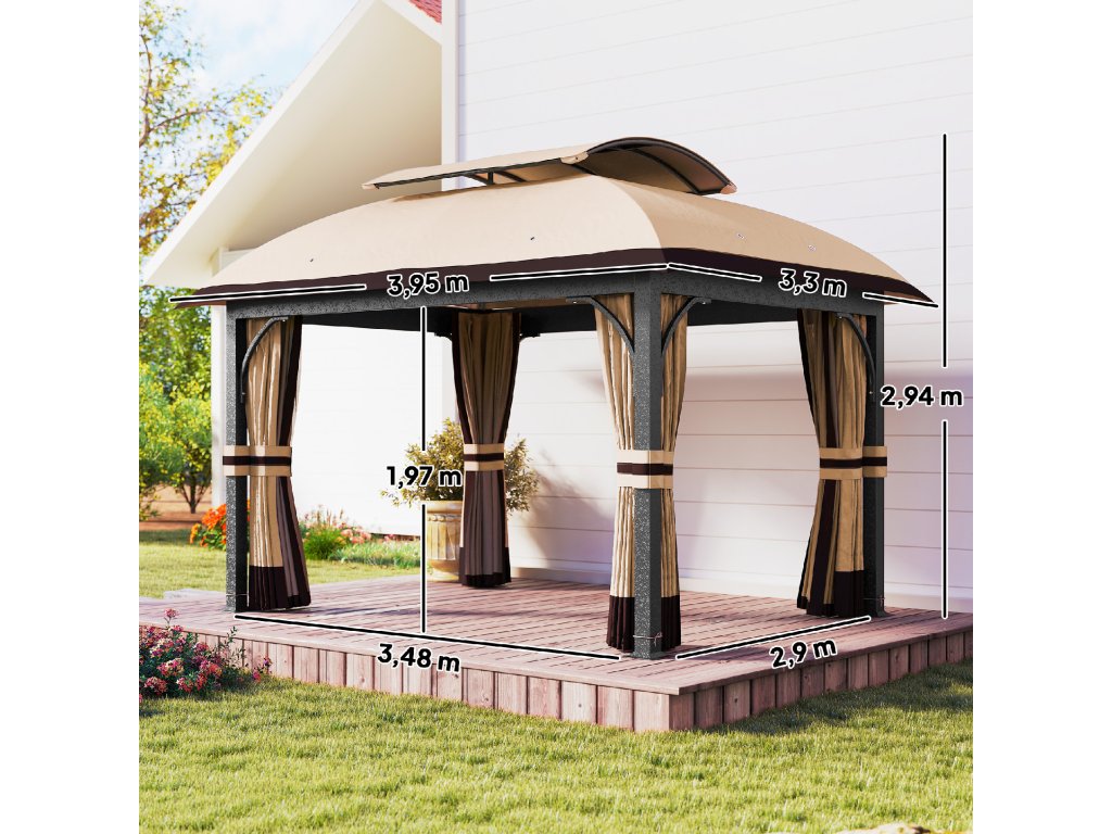 Velký a prostorný: Tento zahradní altán s rozměry 395 D x 330 Š x 294 V cm nabízí 13 m² prostoru a dostatek místa pro 8–10 osob, aniž by se cítily stísněně. Doporučuje se montáž dvěma nebo více osobami.