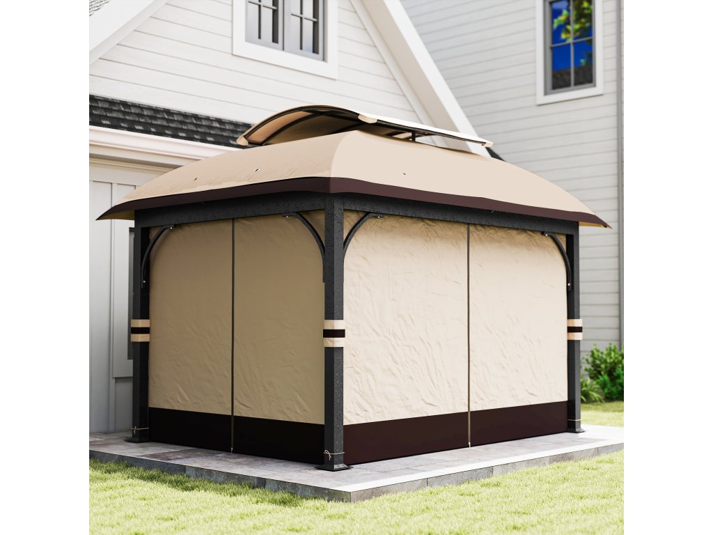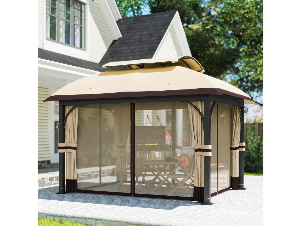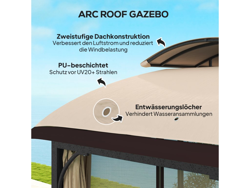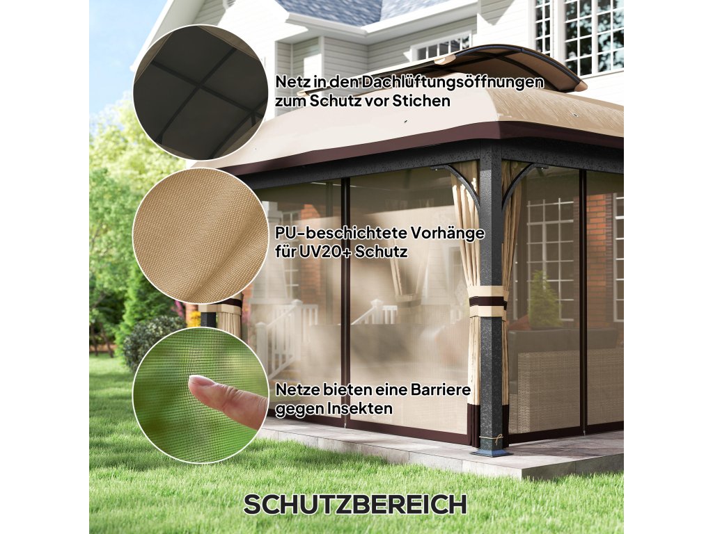 Dvoupodlažní střecha: Užijte si maximální pohodlí s naší inovativní, dvoustupňovou klenutou střechou, která zajišťuje optimální proudění vzduchu. Tento altán snižuje hromadění tepla a tlak větru, zatímco vestavěné síťované větrací otvory zabraňují vnikání hmyzu.
