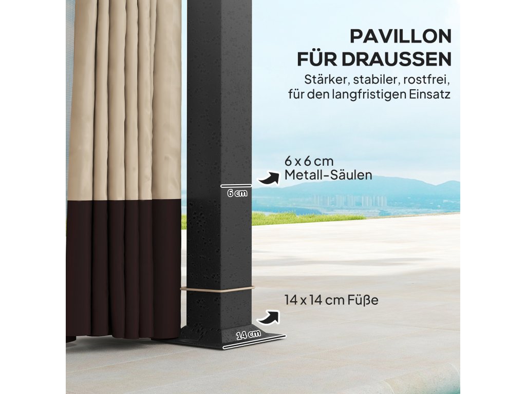 Robustní a stabilní: Tento altán je navržen tak, aby odolal nepříznivým vlivům, a je vybaven kovovými sloupky s práškovým nástřikem o rozměrech 6 x 6 cm a základnami o rozměrech 14 x 14 cm pro výjimečnou stabilitu.