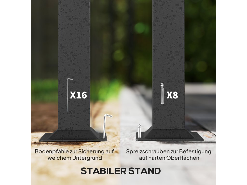 Všestranná a bezpečná montáž: Altán je dodáván s zemními kolíky a rozpěrnými šrouby pro spolehlivé ukotvení na různých površích, doplněnými osmi drenážními otvory, které zabraňují zamokření.