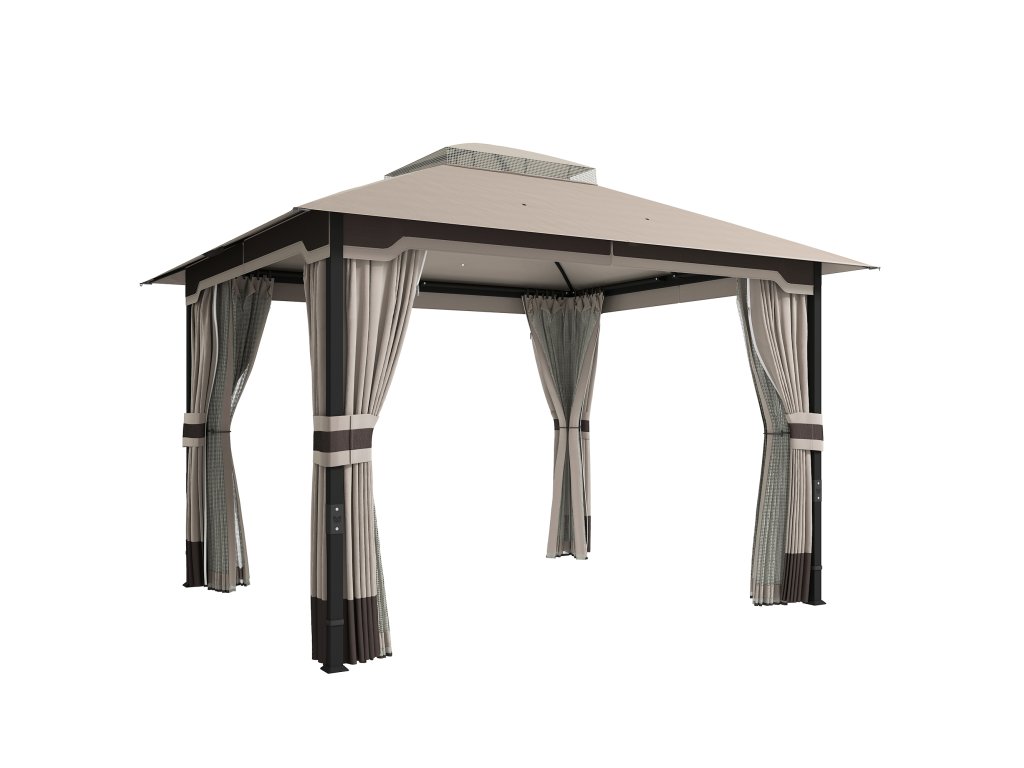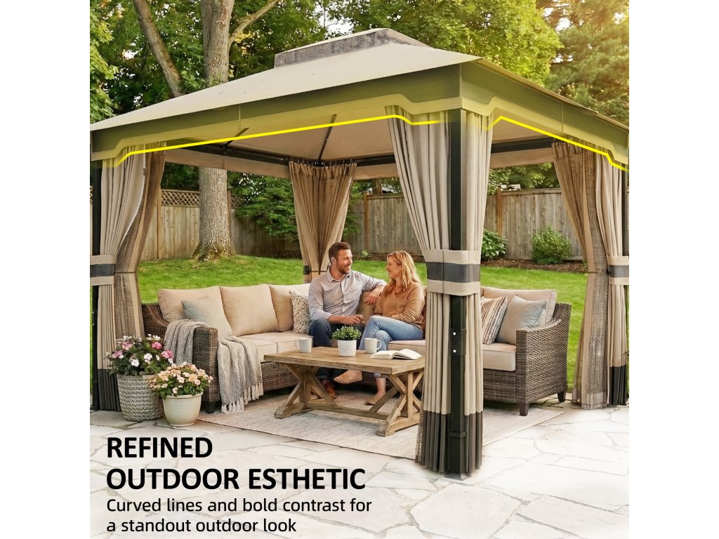 Dvoustupňová střecha: Inovativní altán s odvětrávanou polyesterovou střechou, síťovou clonou pro soukromí, designem barevných bloků a klenutým stropem pro chlazení, pohodlí a elegantní vzhled.