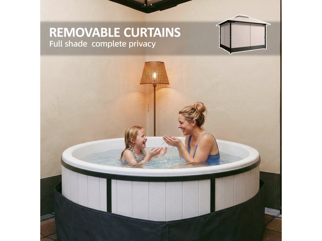 Závěsy a síťová tkanina: Prodyšná síťová struktura pro cirkulaci čerstvého vzduchu a ochranu. Zavřené závěsy vytvářejí soukromé útočiště – ideální pro relaxační chvíle, jako je vířivka.