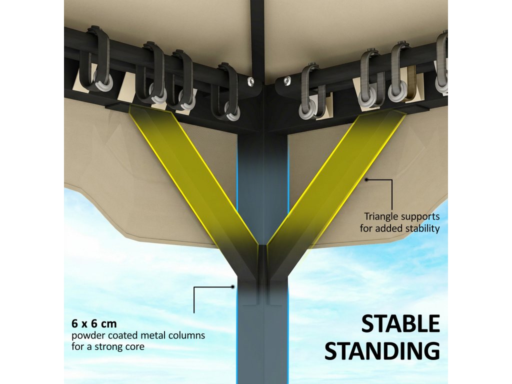 Kovový rám: Práškově lakované kovové sloupky 6 x 6 cm s trojúhelníkovými podpěrami zajišťují trvanlivost a odolnost vůči povětrnostním vlivům. Zemní kotvy zajišťují stabilitu a drenážní otvory zabraňují hromadění vody v altánu.