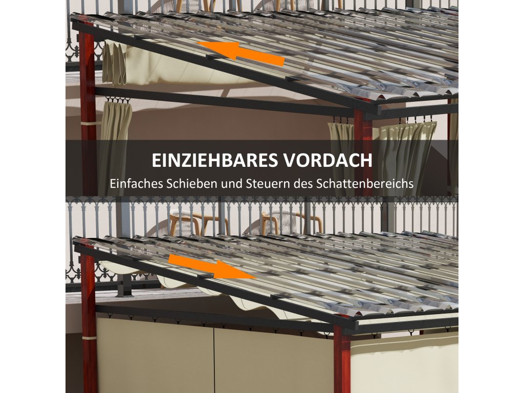 Zatahovací zahradní pergola: Polyesterovou střechu lze přesouvat do různých poloh – snadné přizpůsobení různým světelným podmínkám a místům.