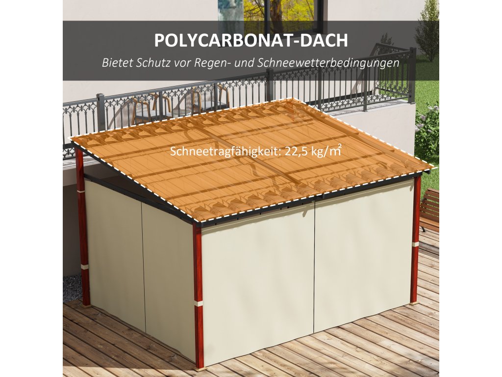 Polykarbonátová střecha: Tato pergola má robustní konstrukci. Střecha z polykarbonátových panelů je pevná a odolná vůči povětrnostním vlivům, odolává dešti i sněhu a má vysokou nosnost 22,5 kg/m².
