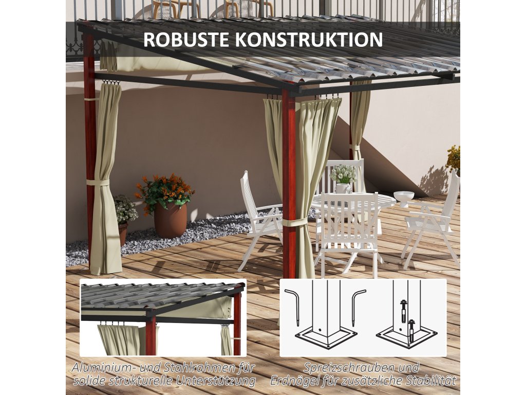Robustní rám: Zahradní pavilon je vyroben z práškově lakovaného hliníku a oceli, je pevný a odolný a poskytuje pevnou konstrukci pro rodinná setkání. Pro větší stabilitu je součástí dodávky osm zemních kotev a osm rozpěrných šroubů.