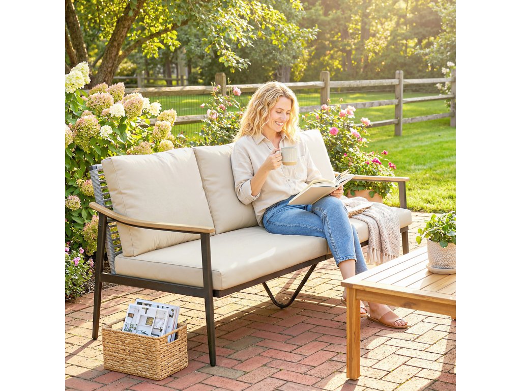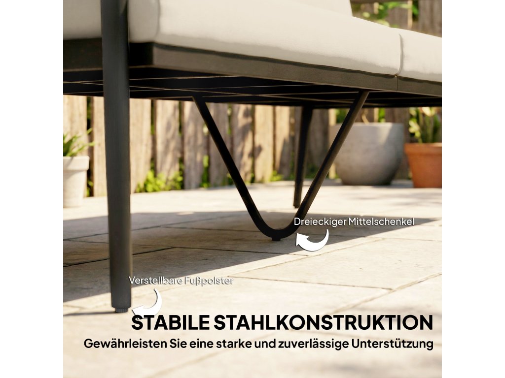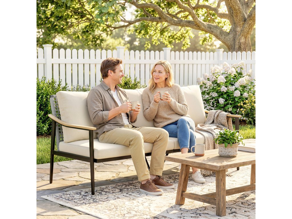 Stabilní rám: Práškově lakovaný ocelový rám s trojúhelníkovou základnou poskytuje odolnou stabilitu až do 360 kg (790 liber). Díky nastavitelným nohám zůstává ratanová pohovka bezpečná a stabilní, a to i na nerovném povrchu teras nebo zahrady.
