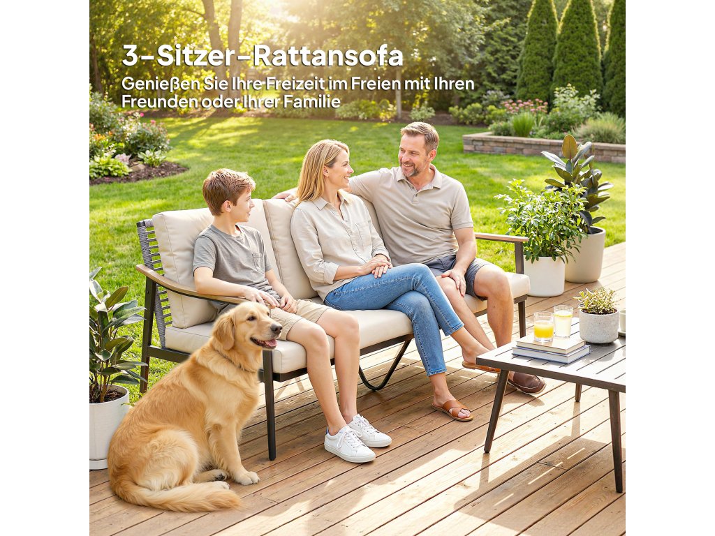 Snadná montáž: Součástí balení jsou všechny potřebné díly a snadno srozumitelný návod k montáži krok za krokem. Tuto třímístnou zahradní pohovku si můžete snadno sestavit a užívat si ji sami během hodiny.