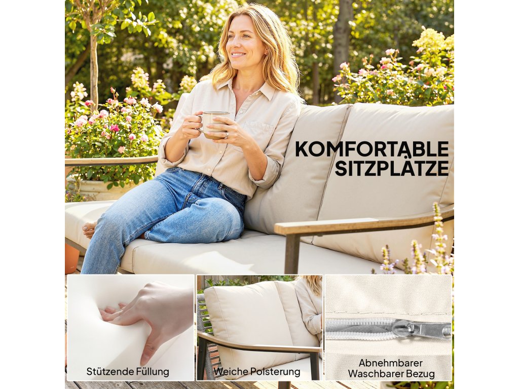Příjemné pohodlí při sezení: Zažijte maximální pohodlí na velkorysém 168 cm širokém a hlubokém sedáku, který je vybaven 8 cm podpůrnými sedáky a 12 cm měkkými opěradly. Ideální pro relaxaci o samotě nebo pro příjemné rozhovory s přáteli. Potahy polštářů mají zipy, takže se snadno sundávají a čistí.