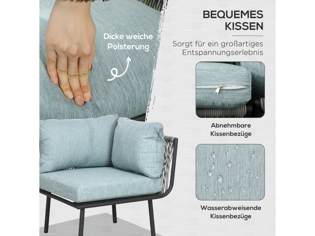 Pohodlné sezení: Tato zahradní sedací souprava obsahuje 10 cm silné polstrované sedáky a 15 cm silné měkké opěrky, do kterých se lze pohodlně zabořit. Potahy polštářů mají zipy a jsou snímatelné a pratelné z hygienických důvodů.
