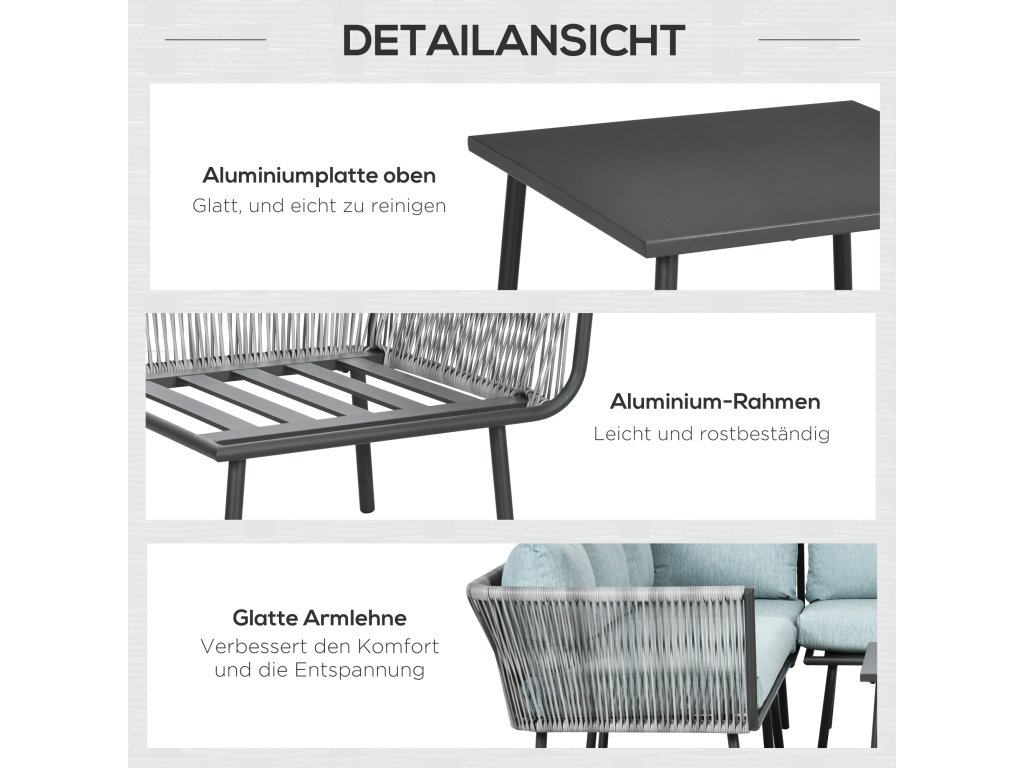 Užijte si relaxační odpoledne s touto venkovní sedací soupravou od Outsunny. Čtyřdílná sada se skládá ze dvou rohových dvoulůžkových pohovek, rohové pohovky a čtvercového konferenčního stolku s lehkým hliníkovým rámem, který zajišťuje robustní konstrukci. Stůl má atraktivní hliníkový povrch a je výškově nastavitelný tak, aby ladil s křesly, takže je ideálním místem pro uložení všech nezbytností po ruce.
