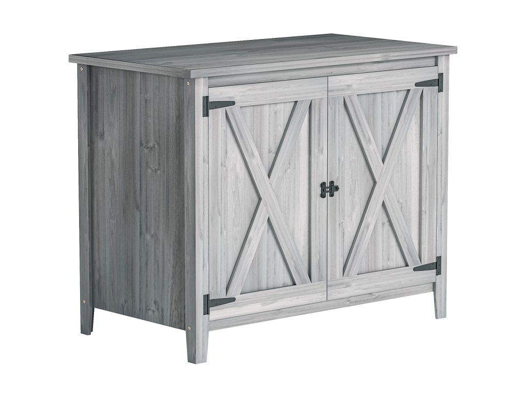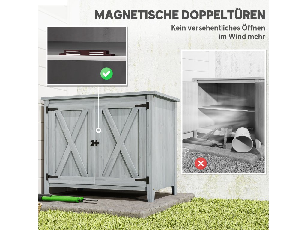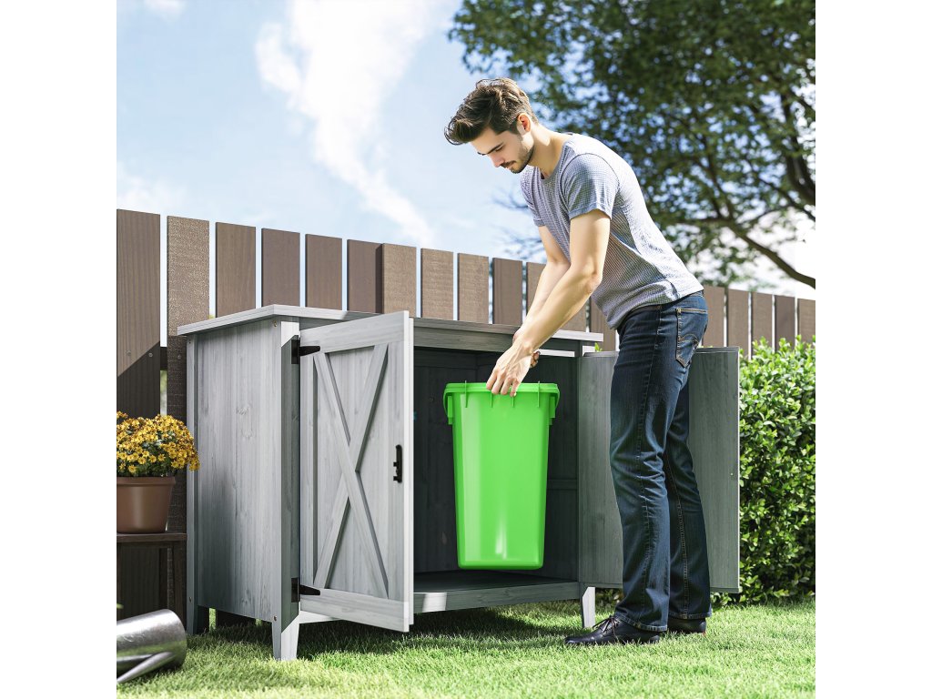 Zahradní skříň Outsunny, dřevěná skříňka na zahradní nářadí, venkovní skříňka na terasu, s dvojitými dveřmi, design stodola, světle šedá barva