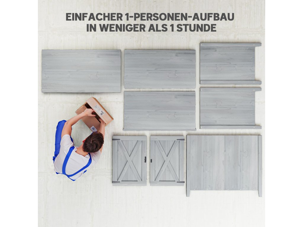 - Ochranná dřevěná konstrukce: Tento zahradní domek vyrobený z masivního jedlového dřeva s ochranným nátěrem a vyvýšenou konstrukcí zajišťuje, že půda zůstane suchá. Doporučuje se pro použití v krytých prostorách, například na balkonech. Pravidelný udržovací nátěr prodlužuje životnost.