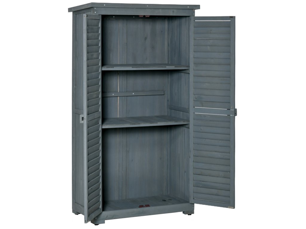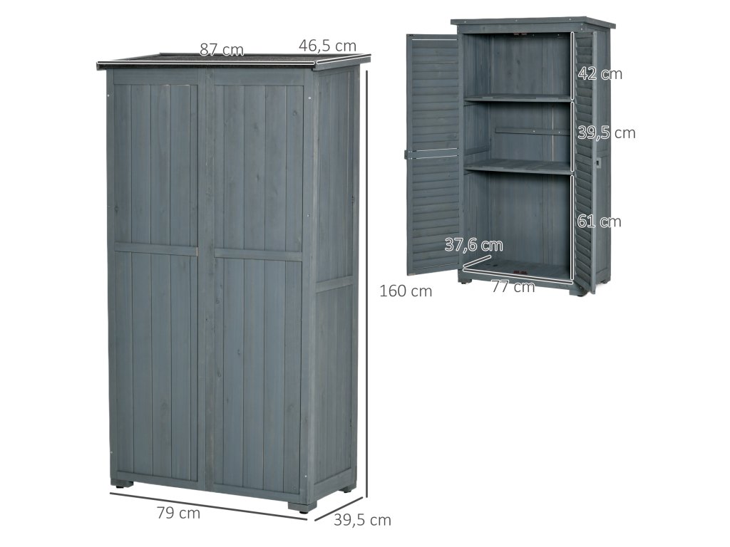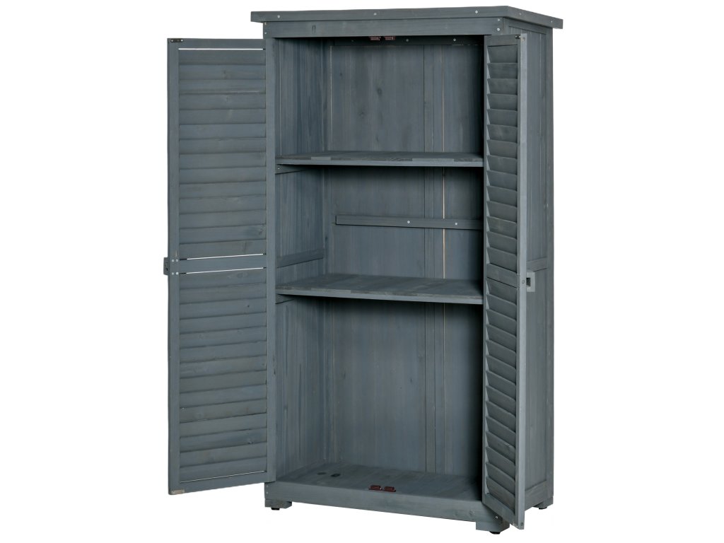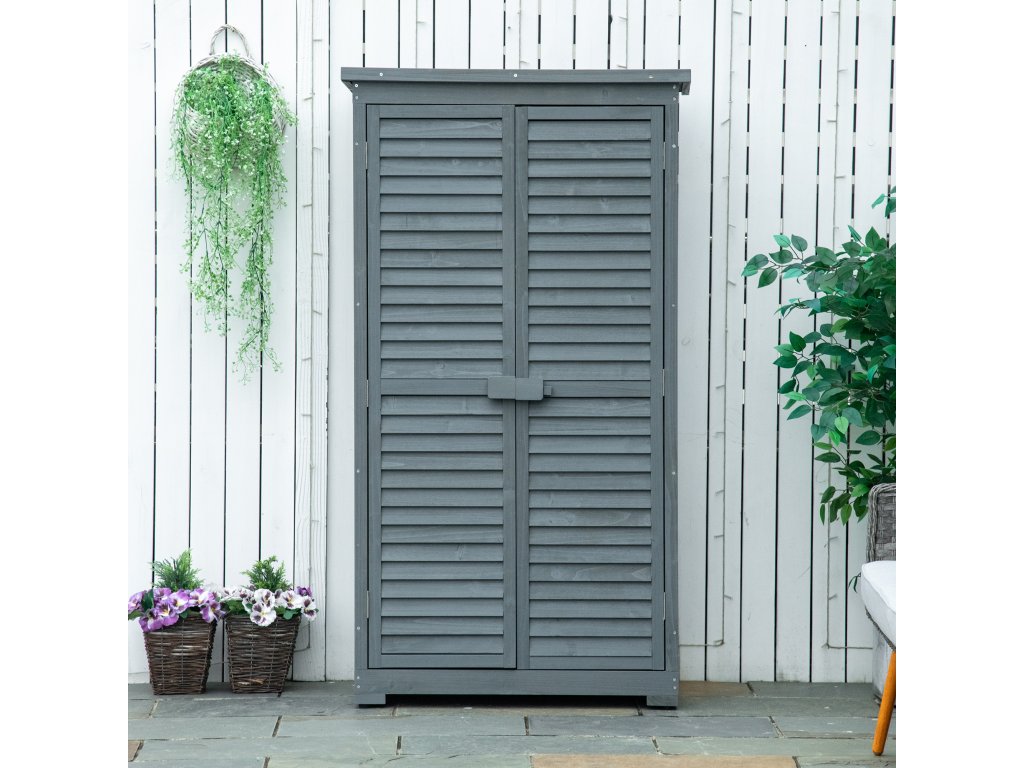 Zahradní skříňka Outsunny, dřevěná bouda na nářadí, skříňka na nářadí, dřevěná chatka, pultová střecha, asfaltové kartonové lamelové dveře, šedá, 87 x 46,5 x 160 cm