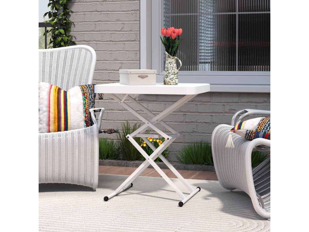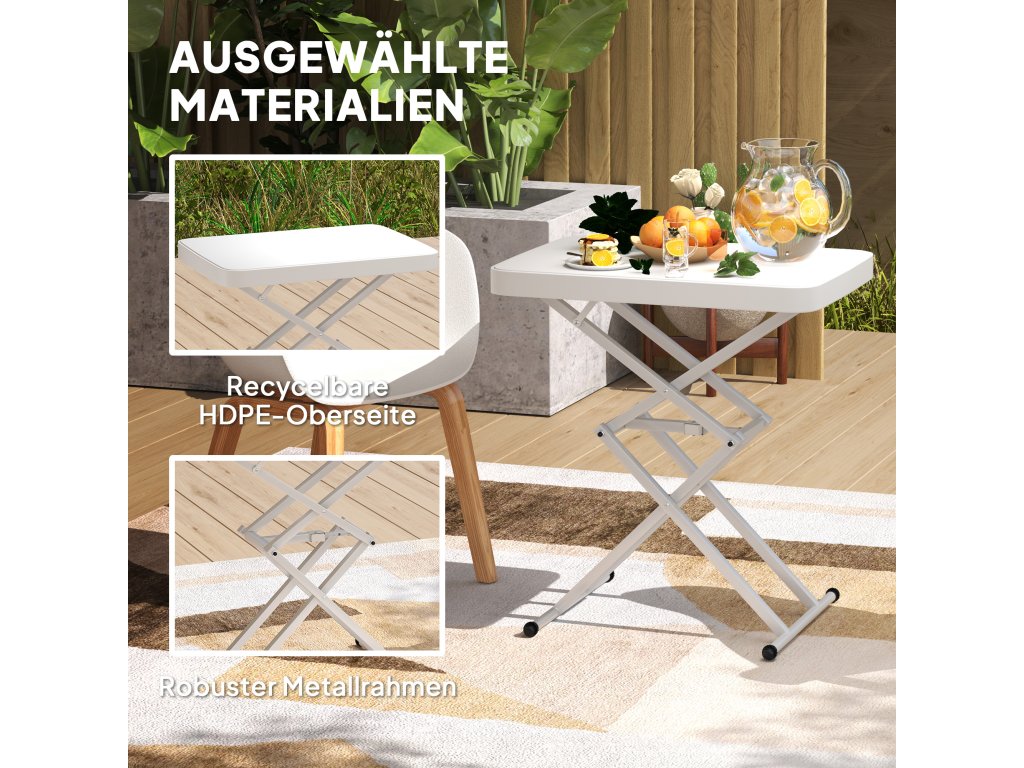 - Vysoce kvalitní materiály: Tento venkovní stolek je vyroben z recyklovatelného plastu a robustního kovového rámu a nabízí vynikající stabilitu a odolnost v interiéru i exteriéru
