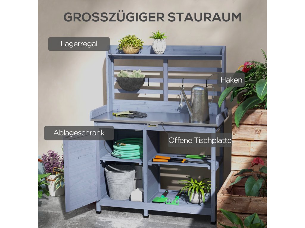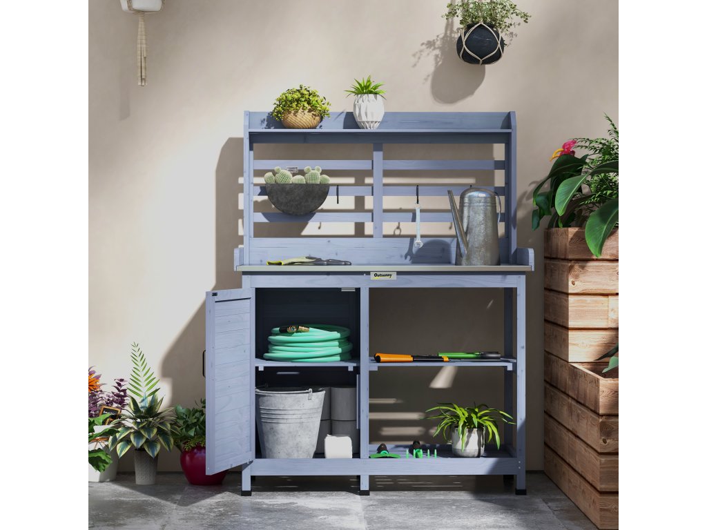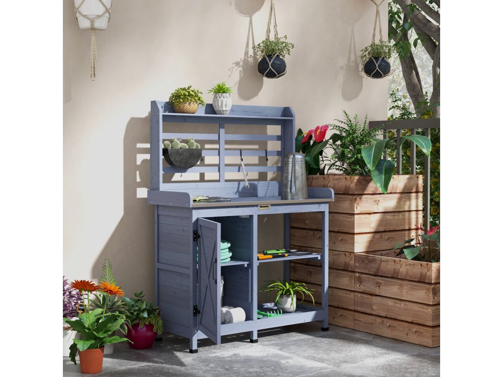 - Optimalizace úložného prostoru: Tento zahradní stůl s přihrádkami a policemi nabízí dostatek prostoru pro rostliny, nářadí a dekorace. Díky tomu je zahradničení mnohem efektivnější a příjemnější