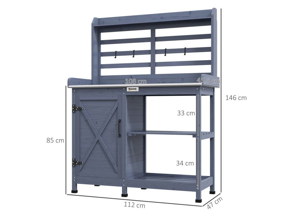 Se stolem na sázení Outsunny získáte nádherný venkovní pracovní prostor, který vám při zahradničení přinese spoustu radosti. Velkorysá pracovní plocha a prostorný úložný prostor nabízejí dostatek místa pro pohodlnou práci na zahradě a přehledné uložení náčiní. Díky povrchové úpravě vodou ředitelnou barvou je venkovní zahradnický stůl chráněn před slunečním zářením a deštěm, takže se nemusíte obávat vlhkosti a koroze.