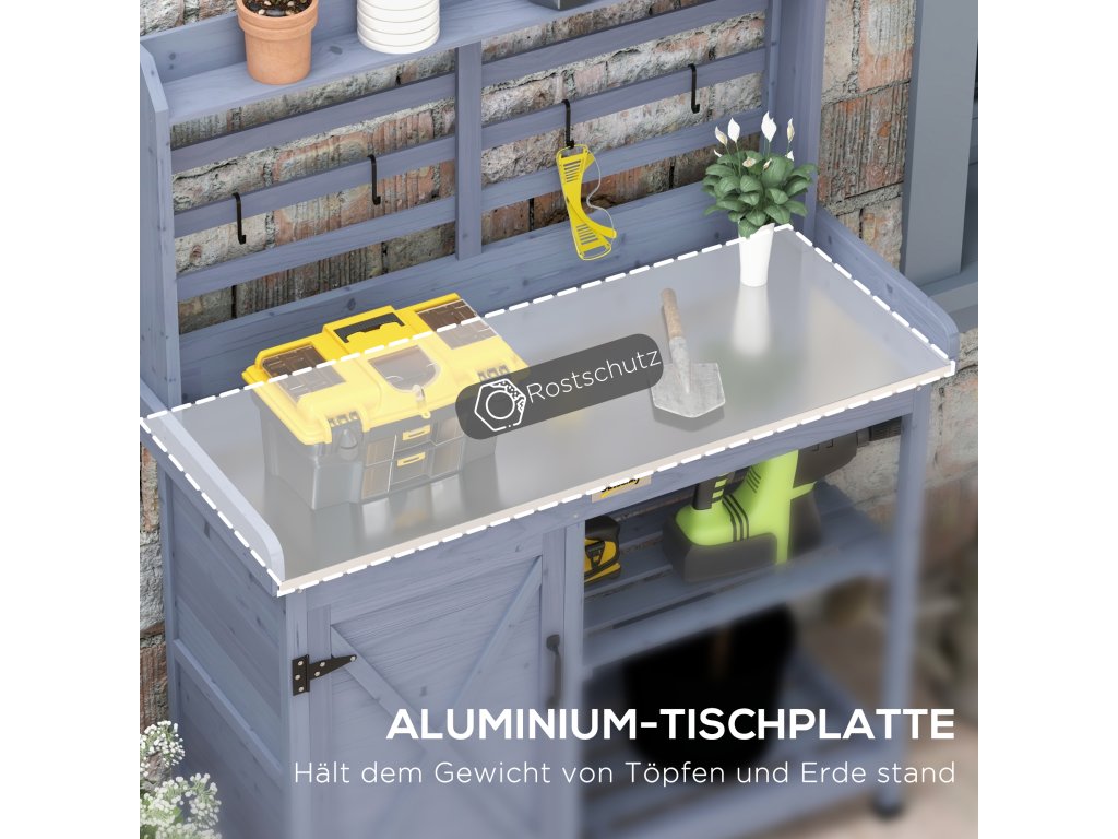 - Odolnost: Hliníková pracovní deska zahradního stolu a voděodolný nátěr činí tento zahradní stůl obzvláště robustním a odolným. Bez námahy unese váhu květináčů a zeminy a je ideální pro pravidelné venkovní používání