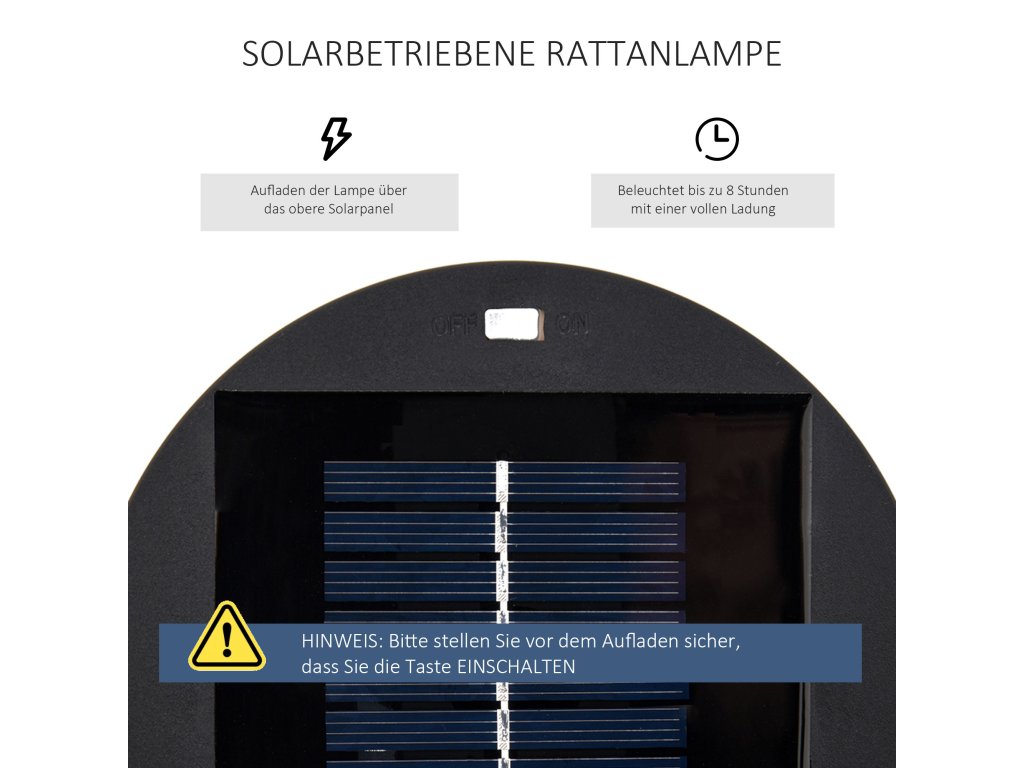 - Solární provoz: K nabíjení interiérového osvětlení stačí pouze sluneční světlo. Světlo se automaticky zapíná a vypíná, aby šetřilo energii, a na plné nabití vydrží svítit až osm hodin.