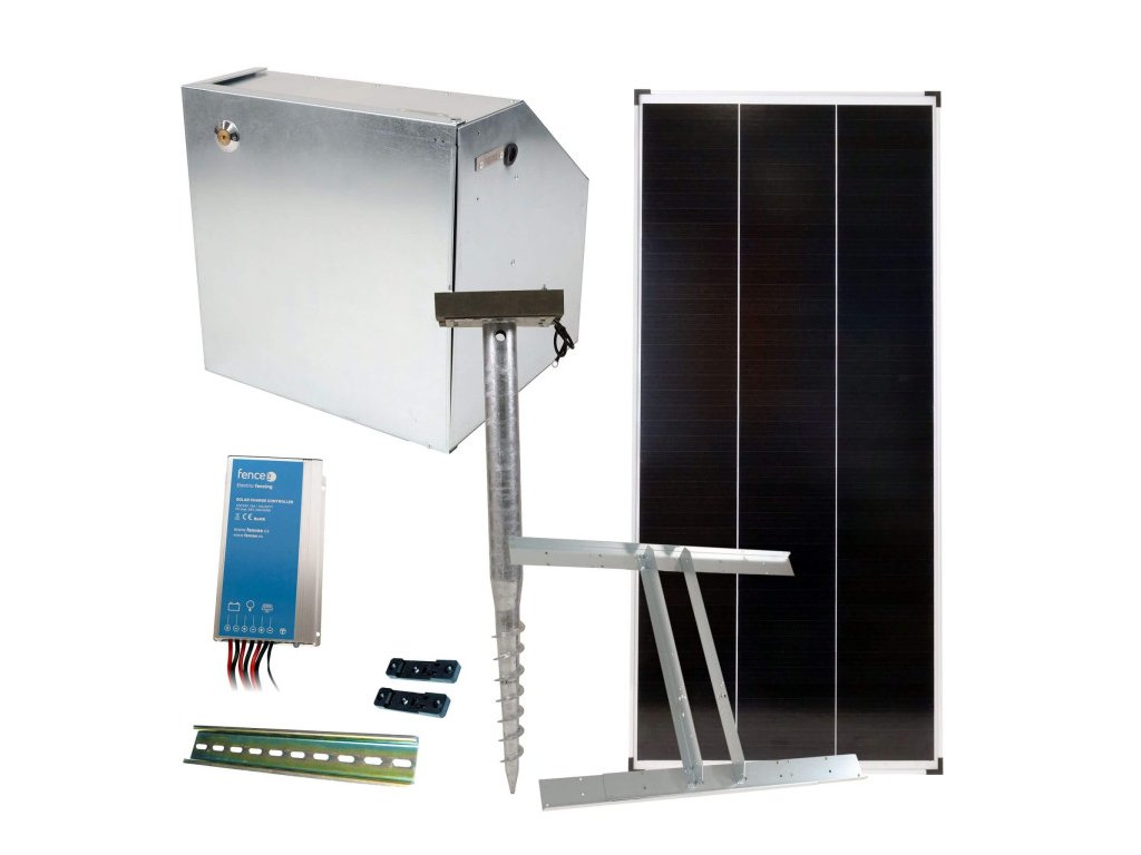 Systém pro solární nabíjení baterie zdroje elektrického ohradníku. Sada neobsahuje generátor a baterii. Baterii a vhodný generátor s kombinovaným napájením je třeba dokoupit.