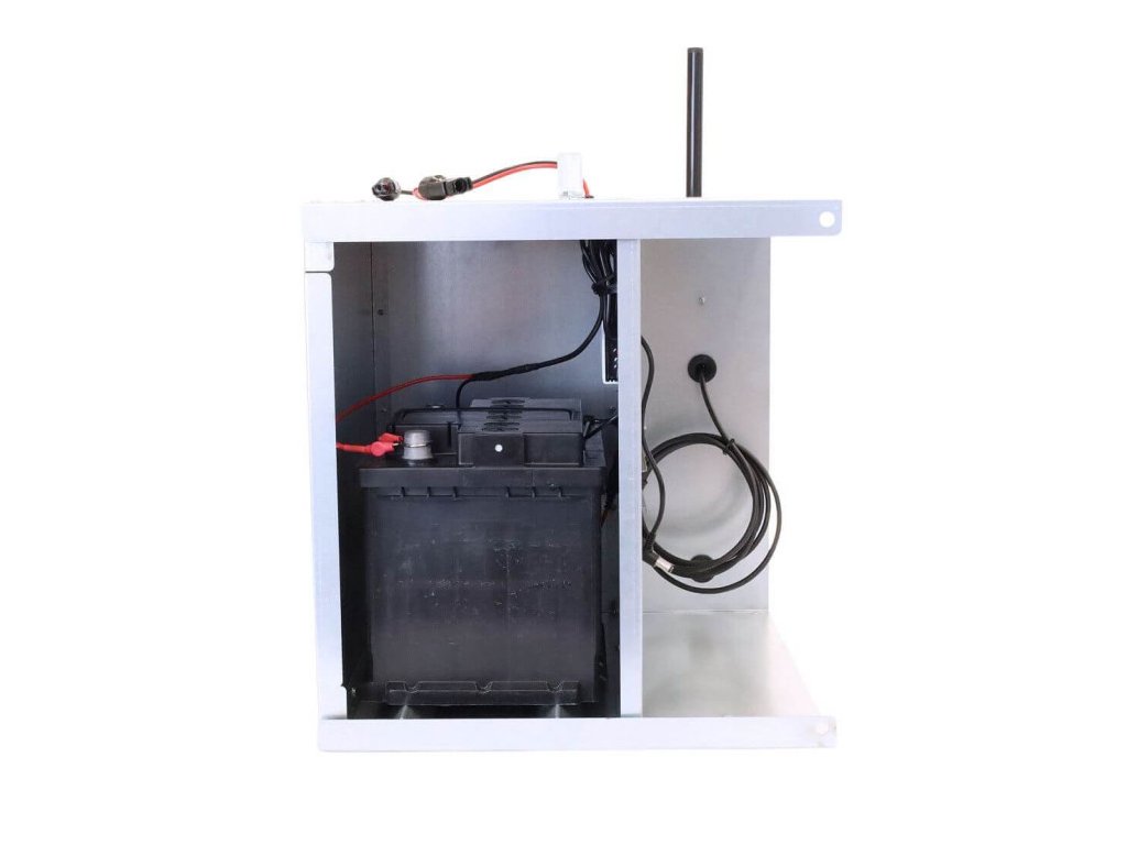 Uzamykatelná posuvná dvířka. Ochrání zdroj elektrického ohradníku s akumulátorem před deštěm, sněhem, povětrnostními vlivy a krádeží. Praktická DIN lišta 200 mm pro snadné upevnění generátoru fencee. Vhodná pro transport a chráněné umístění zdroje.