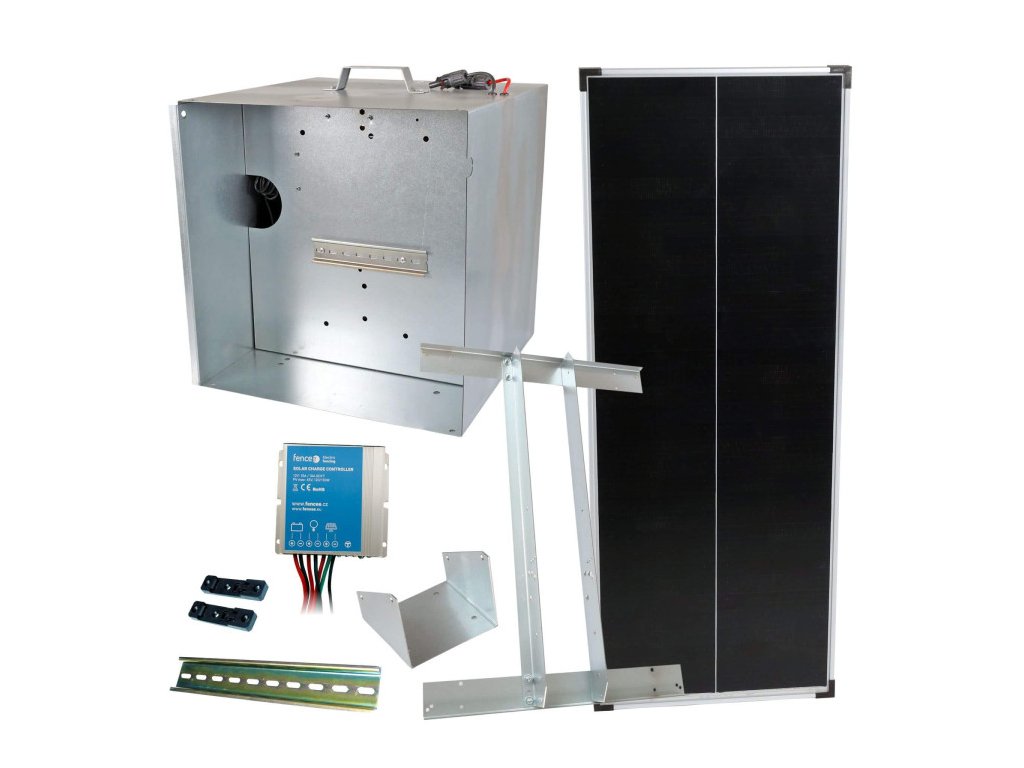 Systém pro solární nabíjení baterie zdroje elektrického ohradníku. Sada neobsahuje generátor a baterii. Baterii a vhodný generátor s kombinovaným napájením je třeba dokoupit.
