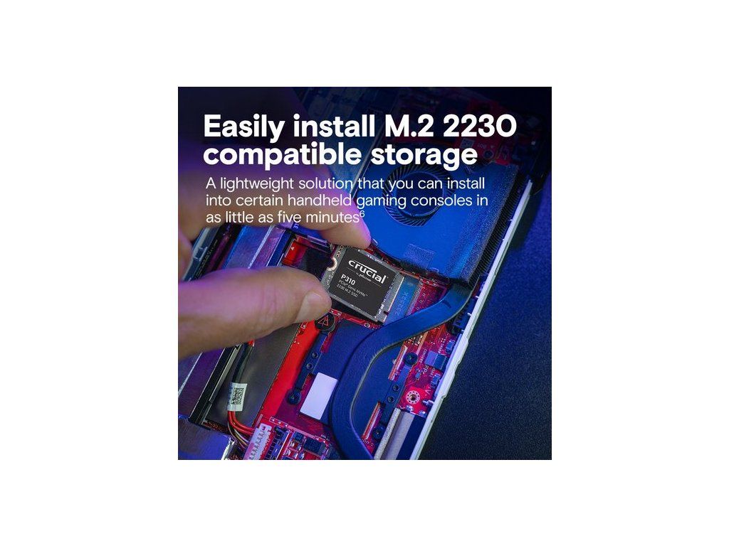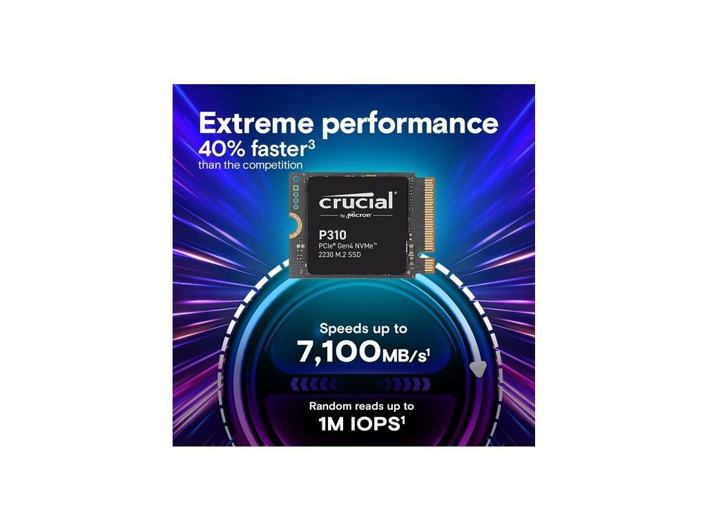 Zásadní P310 2230 NVME SSDMořeDobrýHry Handheld GamingMod, který potřebujete.Větší herní knihovny vyrobily ez Kapacity až 2tb | Uložit a zavést hry s vysokým poptávkou AAA |Vytvořte si knihovnu s vysněním herZásadní P310 2230 NVME SPECIES ObrázekZažijte extrémní výkon Přečtěte si rychlosti až 7 100 MB/S1 Náhodné čte do 1 m iOps1 Spadnout do hry rychlejiZásadní P310 2230 NVME na obrázku notebookuSnadno nainstalujte kompatibilní úložiště M.2 2230 Kompatibilní s určitými kapesními herními konzolemi, jako je Valve Steam Deck ™, Asus Rog Ally ™ a MSI Claw ™ Kompatibilní s některými notebooky, jako jsou Microsoft Surface nebo Select Dell ™ modely Nainstalujte za pouhých pět minut6Zásadní obrázek produktu P310 2230 NVMEZažijte rychlejší hratelnost Nedostávejte rekt na časy zpoždění Načíst graficky náročné hry, rychlejšíZásadní P310 2230 NVME Gamer ImageOptimalizujte životnost baterie na cestách Zlepšená energetická účinnost Hra déle bez dobíjení Typická čísla I/O výkonu měřená pomocí CrytaldistismisMark® s příkazovým frontou Full a Write Cache Enabled. Stav Fresh Out-Of-Box (FOB) je předán. Pro účely měření výkonu může být SSD obnovena do stavu FOB pomocí příkazu Secure Erase. Variace systému budou ovlivňovat měřené výsledky. Některé z kapacity šortek se používají formátování a další účely a nejsou k dispozici pro ukládání dat. 1 GB se rovná 1 miliardě bajtů. Porovnání rychlosti je mezi klíčovými P310 publikovanými nejvyššími rychlostmi 7 100 MB/s a publikovaným konkurentem NVME GEN4 SSD SSD. Váš výkon se může lišit. Micron si vyhrazuje právo na přechod mezi řadou NAND během budoucích výrobních cyklů. Záruka platná po dobu 5 let od původního data nákupu nebo před zapsáním maximálního celkového bajtu (TBW), jak je zveřejněno v datovém listu produktu a měřeno v inteligentních datech produktu, podle toho, co nastane na prvním místě. Před instalací SSD se poraďte s výrobcem vašeho zařízení a ověřte si záruku.SpecifikaceObecná technika série SPESSD P310Rozhraní NVME (PCIE GEN 4 X4)Celková hustota 2TBMnožství sady 1Formový faktor M.2 (2230)SSD Endurance TBW 440TBRychlost a načasováníSekvenční zápis 6000 MB/SSekvenční čtení 7100 MB/SZáruka a výnosyPopis záruky Popis Klíčové nabízí různé úrovně záruky pro různé produkty.Doplňkové parametry