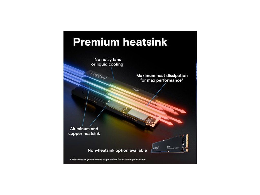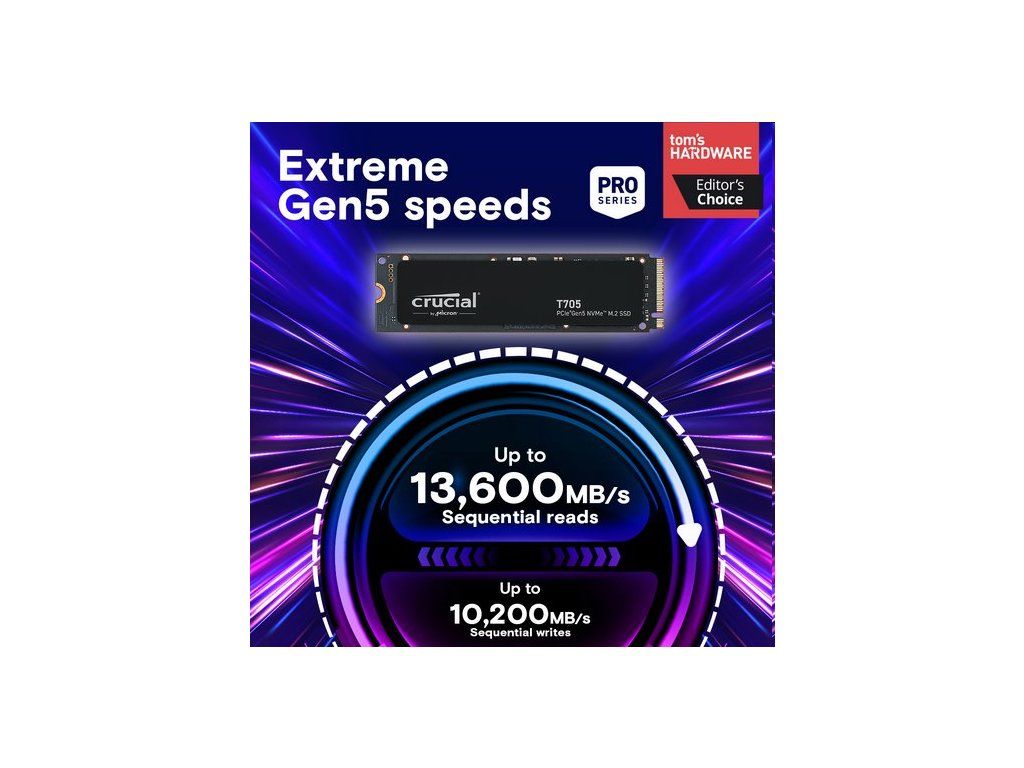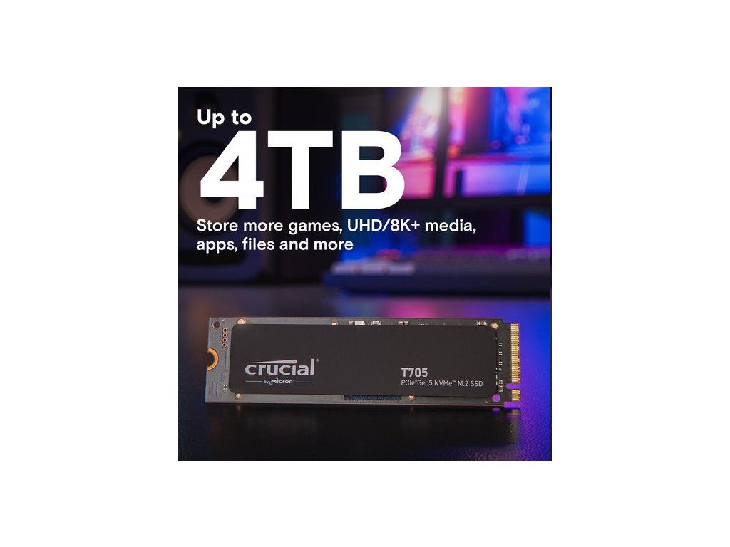Lepší.Rychlejší.Silnější.Díky špičkovému 232vrstvému NAND vám klíčový T705 GEN5 SSD poskytuje výhodu v pracovním výkonu a pracovním vytížení obsahu.Rozmazat hranici mezi virtuálním a realitou Rychlost puchýře Překonává včerejší nejrychlejší SSD bez výrazné zvýšení spotřeby energieZásadní T705 SSD s obrazem systémuCrucial's Best in-Slot Gen5 Gaming SSD Načtěte hry AAA až 15# i6per# rychlejší 9 s DirectStrage Odemkněte potenciál pro podrobnější textury9 Užijte si rychlejší hratelnost a ostřejší grafiku9Zásadní instalační obrázek SSD SSD T705Bezkompromisní prémiový heathink Konstrukce hliníku a mědi Maximální teplotní dispekty4 Žádné hlučné ventilátory ani chlazení tekutiny K dispozici je volička non-heatsink1Klíčový obraz T705 SSD a balíčekRevoluční rychlost splňuje kompatibilitu Spolupracuje s intel® Core 13-14th Gen CPU Pracuje s procesory řady AMD Ryzen ™ 7000 Silný výkon pro aplikace AI a další Zpětný kompatibilní se systémy Gen3 a Gen4.1. Neheatsinkové verze klíčového T705 musí být nainstalovány se základní deskou nebo alternativním chladičem, aby bylo dosaženo optimálního výkonu.2. Typický výkon I/O měřen pomocí CrystalDiskMark® s hloubkou fronty 512 a povoleným mezipaměti zápisu. Izolace jádra Windows 11 deaktivována pro měření výkonu. Stav Fresh Out-Of-Box (FOB) je předán. Pro účely měření výkonu může být SSD obnovena do stavu FOB pomocí příkazu Secure Erase. Variace systému budou ovlivňovat měřené výsledky.3. viz mikron.com/products/nand-flash pro více informací.4. Za typických podmínek pro proudění vzduchu a okolní teploty umožňuje náš prémiový chladič T705 Gen5 SSD běžet při maximálním pracovním zátěži bez nutnosti tepelné škrticí klapky. Srovnání provedené s teplotami SSD bez chladicího přístroje. Ujistěte se, že váš pohon má správný proud vzduchu pro maximální výkon. 5. Ve srovnání s rozhodujícím T500 Gen4 NVME® SSD se uvedenou rychlostí 7 400 MB/s. Skutečná rychlost se může lišit.6. Formátování a další účely se používá úložiště SEME a není k dispozici pro ukládání dat. 1 GB se rovná 1 miliardě bajtů.7. Ve srovnání s výkonem GEN5 SSD bez přímého stupně, založené na interních výsledcích testu s podporovanou GPU, která používá dekompresi GPU.8. Ve srovnání s klíčovou rychlostí MX500 SSD SSD 560 MB/s. Skutečná rychlost se může lišit.9. Výkon Fresh-Out-Of Box (FOB) měřený a typický pracovní zátěž Microsoft ve srovnání s průměrným výkonem FOB Micron 3400 a 3500 SSD se simulárním pracovním vytížením.10. Záruka platná po dobu 5 let od původního data nákupu nebo před zapsáním maximálního celkového bajtu (TBW), jak je zveřejněno v datovém listu produktu a měřeno v inteligentních datech produktu, která je na prvním místě. 11. Čaroměsíční bezplatné Adobe® Creative Cloud Personal All Apps Plan, který je k dispozici s způsobilým klíčovým nákupem SSD. Adobe Creative Cloud ID a klíčová registrace produktu potřebná pro vykoupení. Způsobilé klíčové T705 SSD: CT1000T705SD3, CT2000T705SD3, CT4000T705SSD3, CT1000T705SSD5, CT2000T705SD5, CT4000T7055SD5 nebo CT2000T5A 31, 2024. Nákup a registrace SSD; Až dva na Adobe Creative Cloud Cloud User Account, s výhradou přijetí příslušných podmínek použití, zatímco doprovody aktivačního kódu vydrží. Mohou se vztahovat další smluvní podmínky. Micron Technology si vyhrazuje právo změnit nebo přerušit tuto nabídku kdykoli bez předchozího upozornění.12. To zajišťuje optimální výkon a udržujte si záruku SSD T705 při instalaci pomocí chladicího ohně v mateřské desce, nesmíte odstranit štítk s oblečením mědi. 13. Ve srovnání s průměrem šířky pásma pro mikron 3400 a 3500 SSD.Obecná řada Tech SPESSD T705Rozhraní NVME (PCIE GEN 5 X4)Celková hustota 4TBMnožství sady 1Formový faktor M.2 (2280)SSD Endurance TBW 2400TBRychlost a načasováníSekvenční zápis 12 600 MB/SSekvenční čtení 14 100 MB/SNáhodné zápis 1800K IOPSNáhodné čtení 1500K IOPSZáruka a výnosyPopis záruky Popis Klíčové nabízí různé úrovně záruky pro různé produkty.Doplňkové parametry