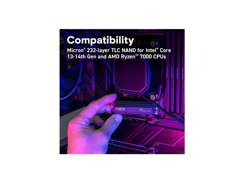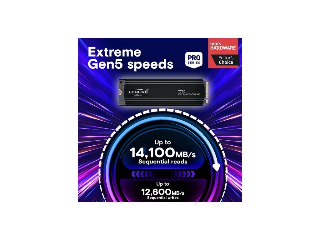 Zásadní T705 4TB PCIe Gen5 NVME M.2 SSD s HeatsinkuCT4000T705SSD5(0,0)Hold On Pevně -Crucial® T705 GEN5 NVME® SSD posouvá výkon Gen5 na další úroveň. Pohoďte s hraním her, vytvářejte rychlostí nápadů a s lehkostí pomocí aplikací AI s tímto plně optimalizovaným mistrovským dílem Gen5, které pracuje s vášm chladičem základní desky.SpecifikaceObecná řada Tech SPESSD T705Rozhraní NVME (PCIE GEN 5 X4)Celková hustota 4TBMnožství sady 1Formový faktor M.2 (2280)SSD Endurance TBW 2400TBRychlost a načasováníSekvenční zápis 12 600 MB/SSekvenční čtení 14 100 MB/SNáhodné zápis 1800K IOPSNáhodné čtení 1500K IOPSZáruka a výnosyPopis záruky Popis Klíčové nabízí různé úrovně záruky pro různé produkty.Doplňkové parametry