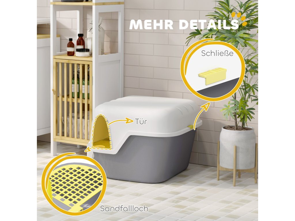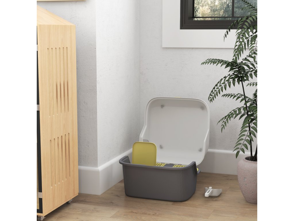 Objevte stylový a praktický zásobník na kočičí stelivo PawHut s víkem. Polootevřená konstrukce s otvorem na písek udržuje nečistoty uvnitř, zatímco vaše kočka může snadno vstupovat a vystupovat. Uzamykatelné víko misky lze otevřít pro čištění a poskytuje ještě více prostoru pro prostornou, krytou misku na stelivo pro kočky o hmotnosti do 3,5 kg. Chytrý design pro pohodlí a čistotu!