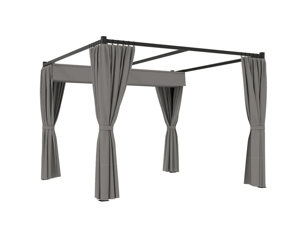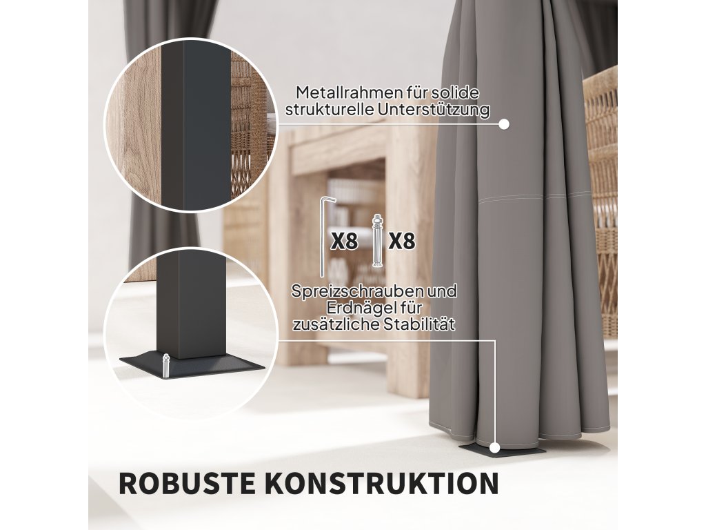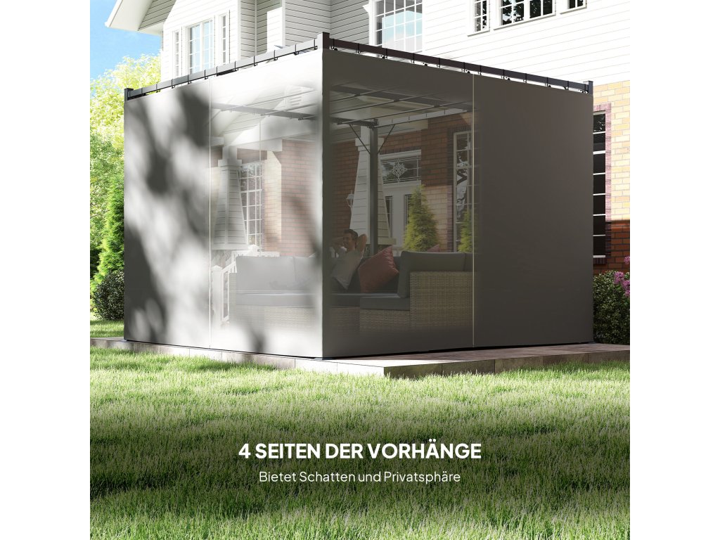 Čtyři závěsy: Plně uzavírající ze všech stran, což vám umožňuje rychle a snadno vytvořit otevřený nebo uzavřený prostor s tímto stylovým krytem terasy.