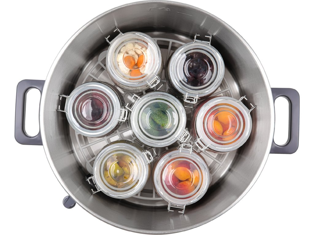 Jsem nerezový zavařovací hrnec a pojmu až 14 sklenic s objemem 1 l.