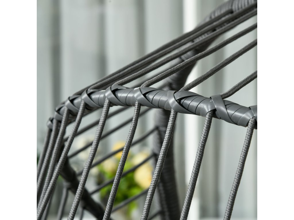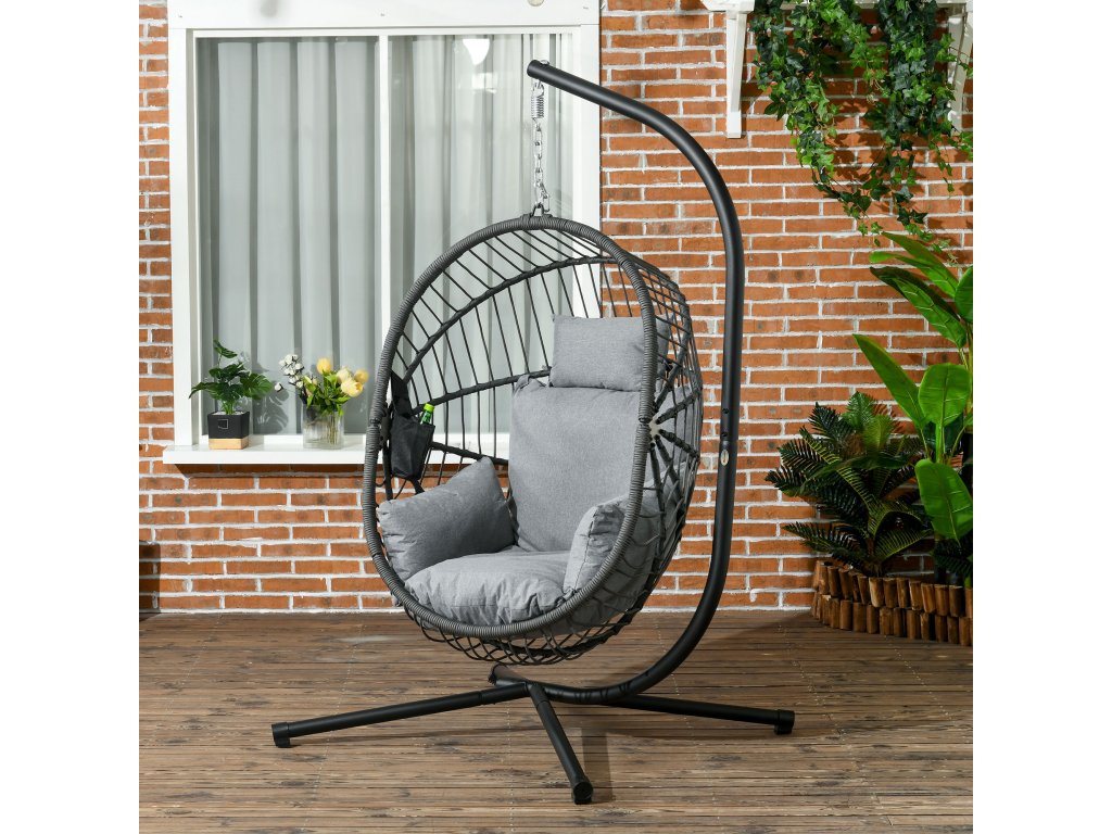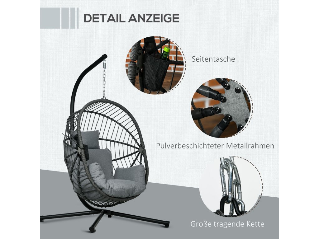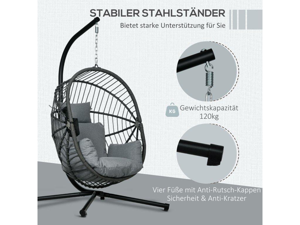 Závěsná houpačka Outsunny s polštářkem a držákem nápojů, skládací sedací koš v ratanovém vzhledu, nosnost až 120 kg, ocel, šedá