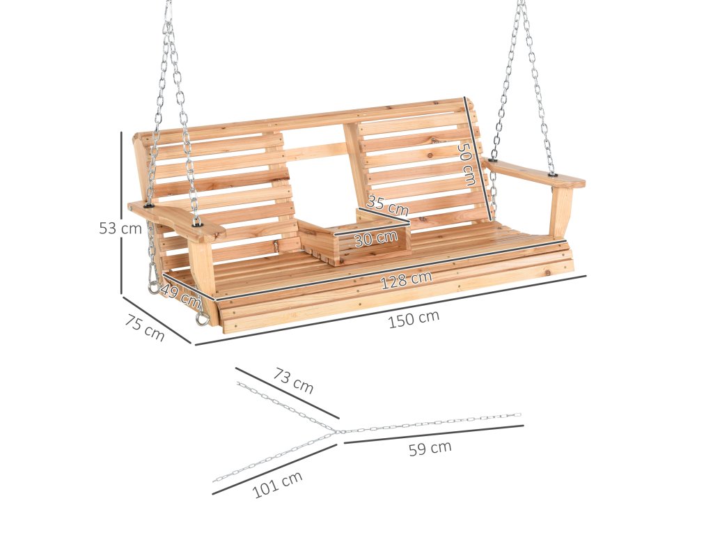Závěsná lavice Outsunny se skládacím stolkem a držáky na nápoje z přírodního dřeva 150 x 75 x 53 cm