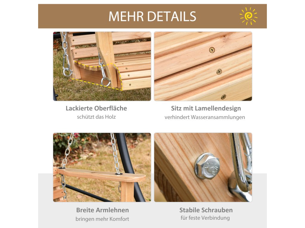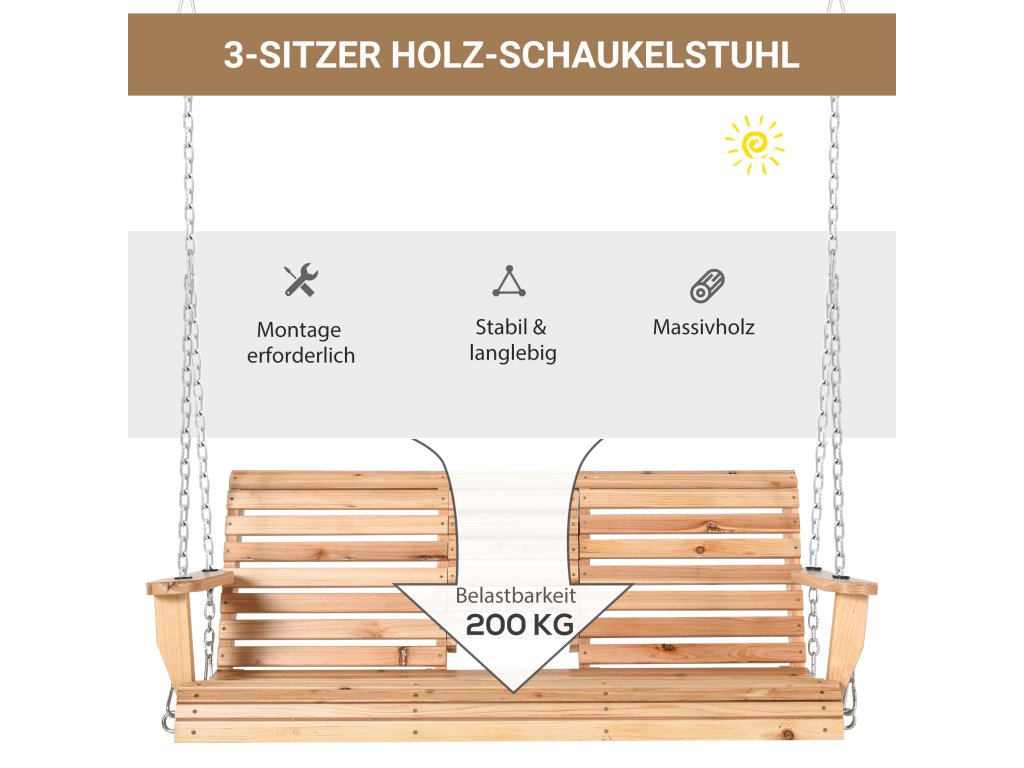 Toto třímístné houpací křeslo Outsunny má vkusný vzhled a je vynikajícím doplňkem vaší zahrady! Houpací křeslo je vyrobeno z masivního jedlového dřeva, a proto je obzvláště robustní. Lakovaný povrch chrání dřevo před deštěm a opotřebením. Široké područky a velkorysý sedák vám nabízejí mimořádně pohodlné sezení.