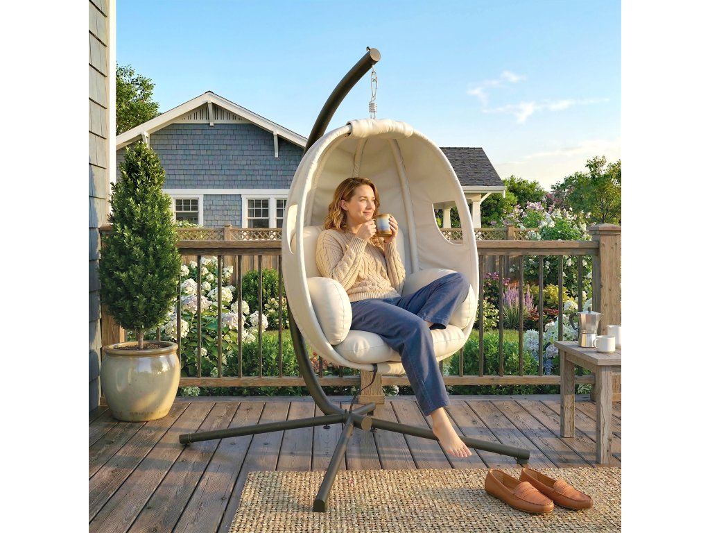 Všestranné relaxační místo: Ať už jako útulný čtecí koutek na balkoně, klidná zóna na zahradě nebo relaxační útočiště v ateliéru, toto závěsné křeslo se hodí do jakéhokoli prostoru. Celkové rozměry: 117 D x 95 Š x 180 V cm, nosnost: 120 kg. Nutná montáž.