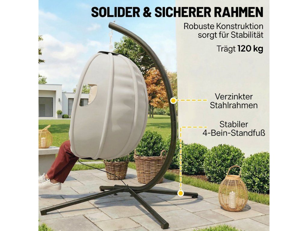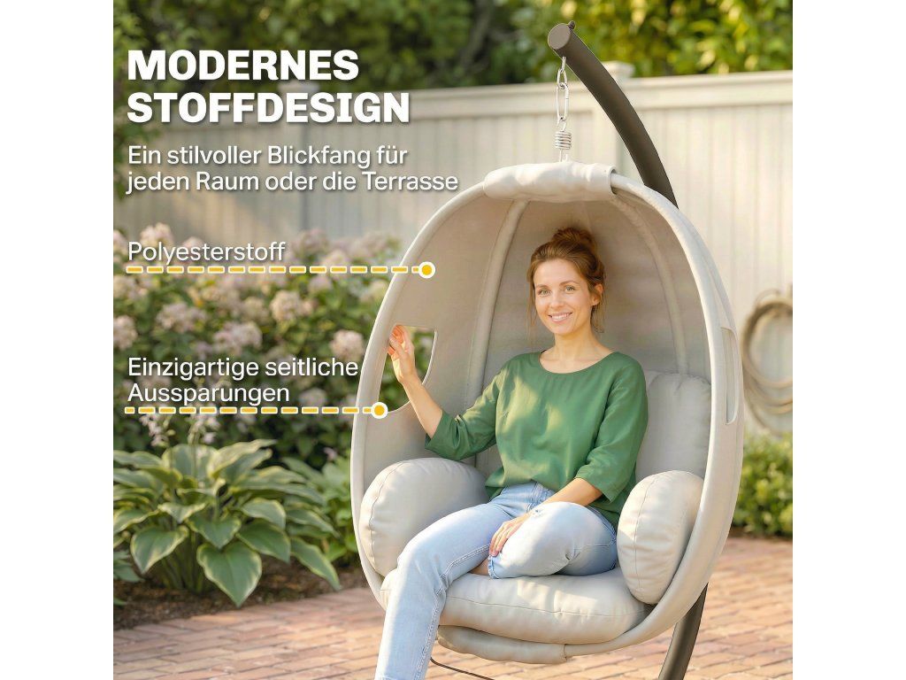 Moderní design látky: Toto závěsné křeslo je vyrobeno z vysoce kvalitní polyesterové látky o gramáži 230 g/m² a má elegantní boční části výřezy, které vytvářejí stylový a moderní vzhled. Ideální jako ústřední bod v obývacím pokoji, ložnici nebo na terase.