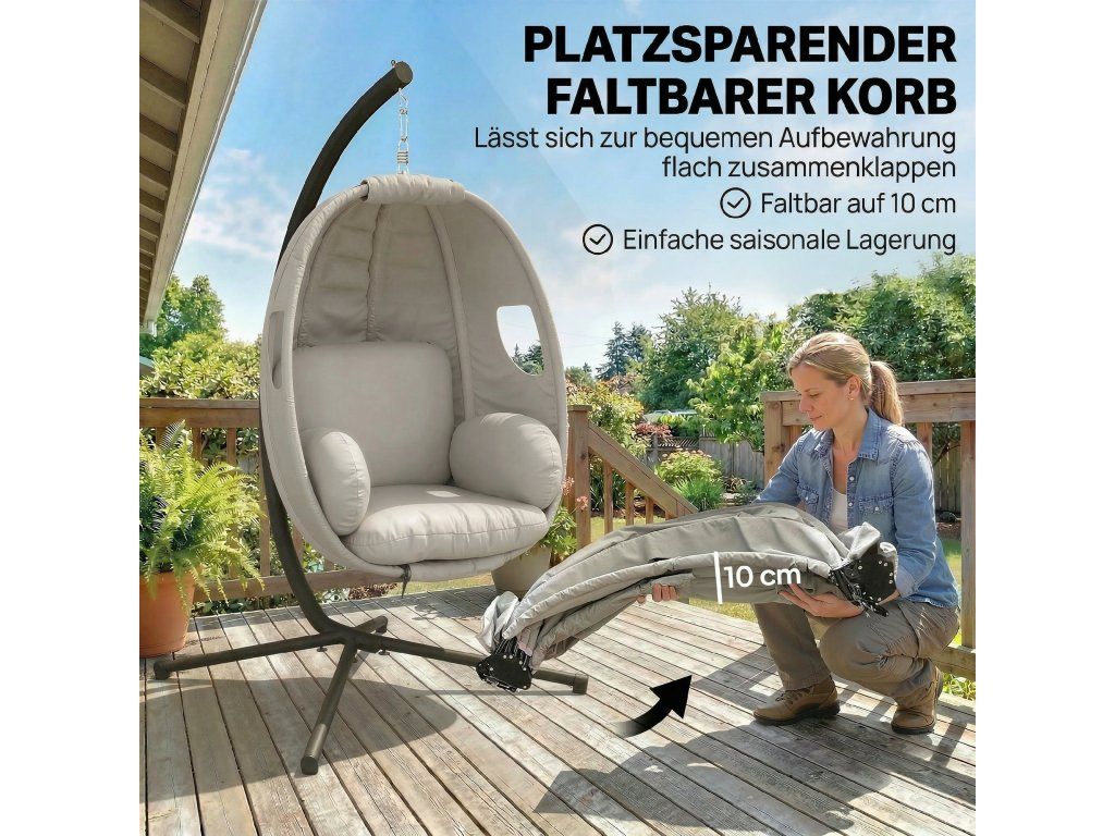 Snadné skládání: Košík tohoto závěsného křesla se snadno složí na tenkou tloušťku 10 cm (100D x 63Š x 10V cm), což usnadňuje skladování během mimosezóny nebo uvolňuje prostor pro jiné aktivity.